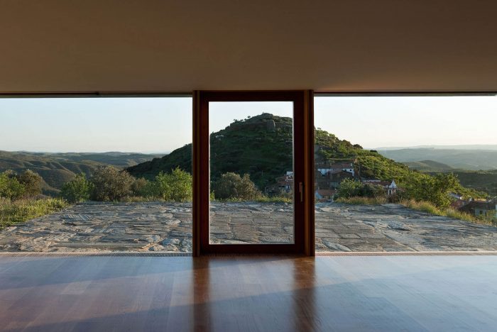 The house to be constructed intends to establish a visual relation with the surrounding landscape, mainly the castle and the astonishing valleys planted with olive trees or almond trees. On the other hand, in the centre of this terrain there is a particular pre-existence with rather interesting characteristics, both for its patrimonial nature, and for the beauty and interest in safeguard, which is the threshing-floor in stone - granite and slate, in pieces of huge dimensions and a rather interesting design. The threshing-floor itself has 15m by 15m.