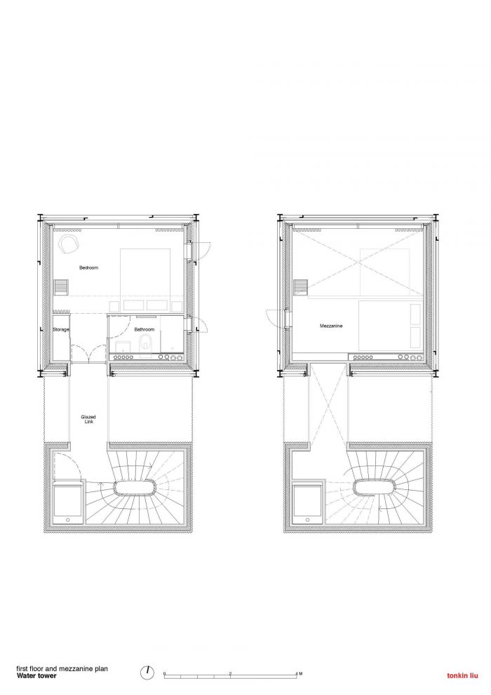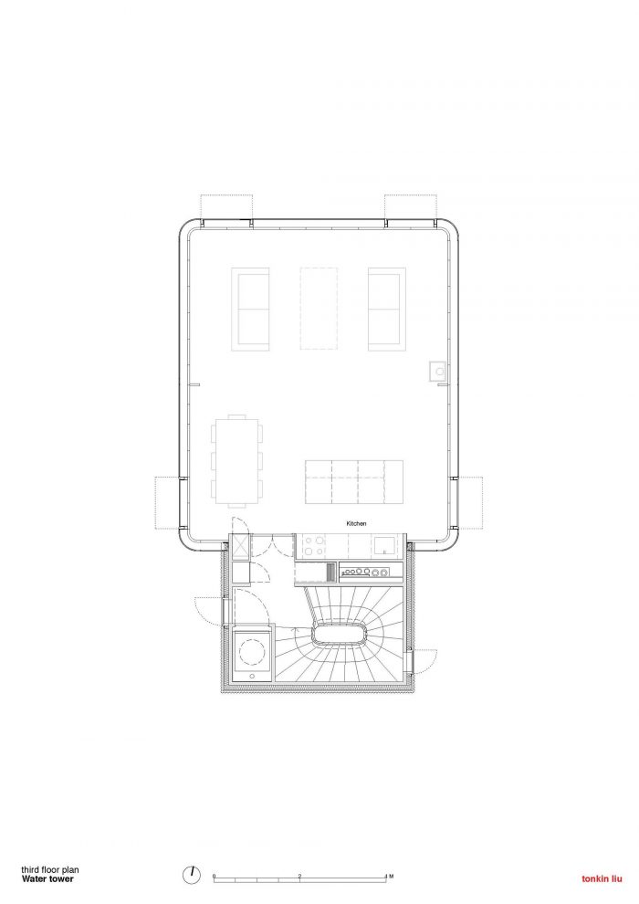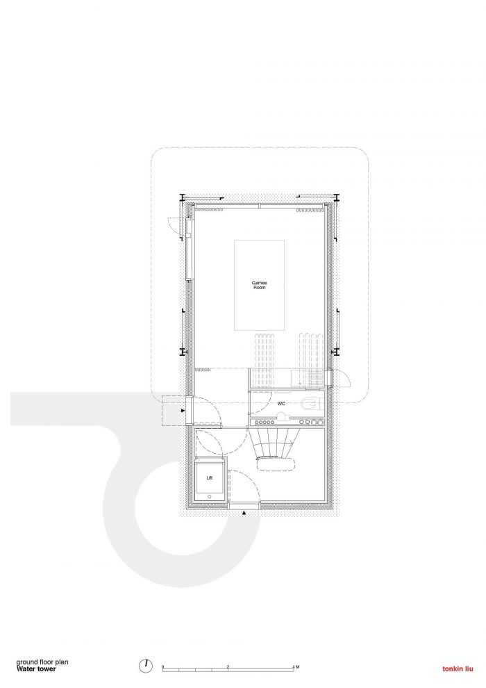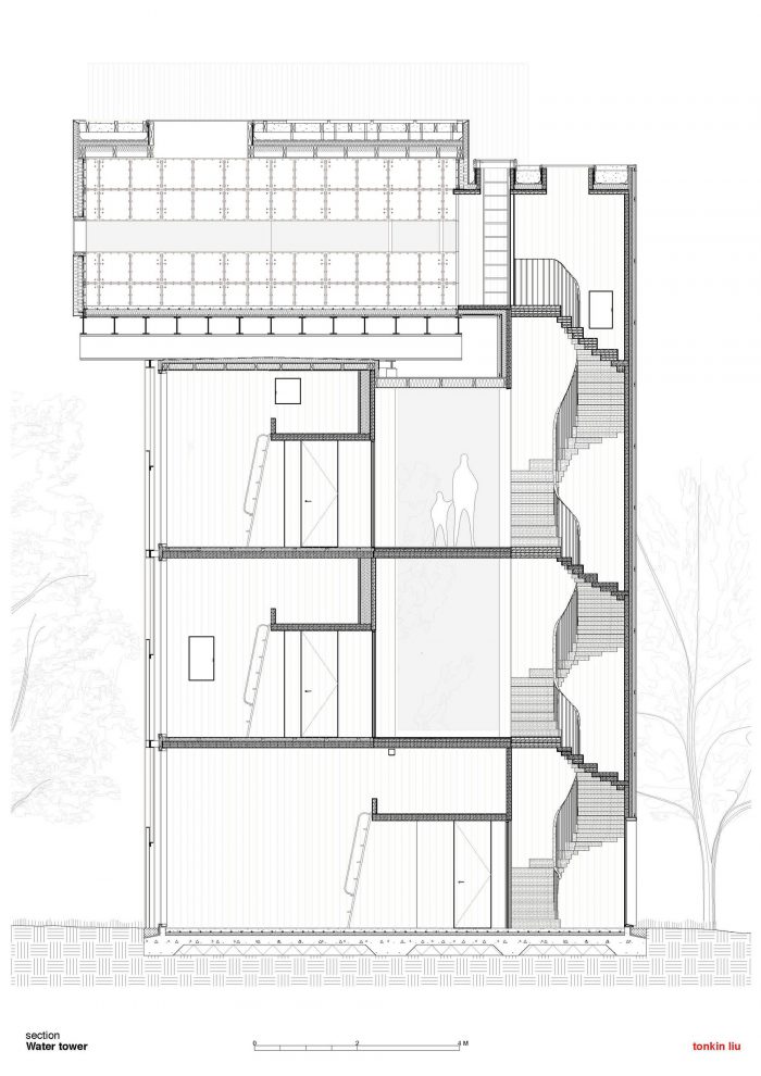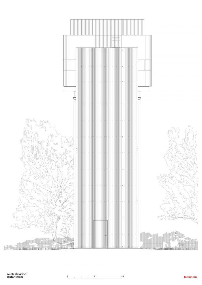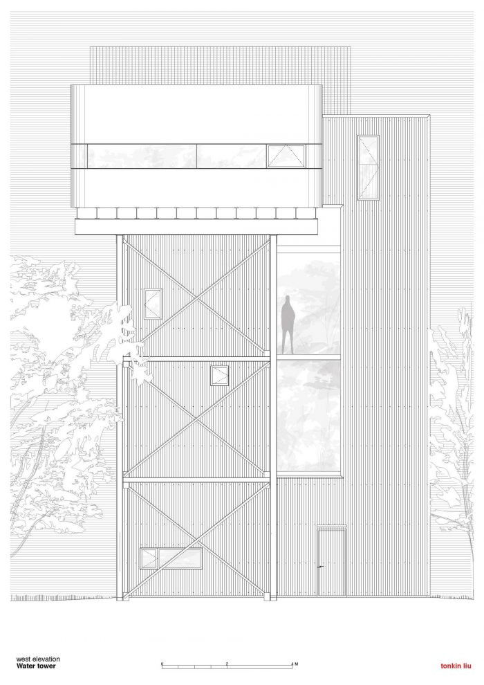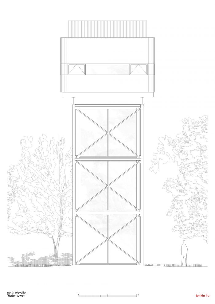 水箱本身将被重新用作生活和餐饮空间,下面悬挂着两间卧室和一个底层花园房间,使该结构与周围的荒野融为一体。南部将增加一个独立的楼梯塔,供人进出。