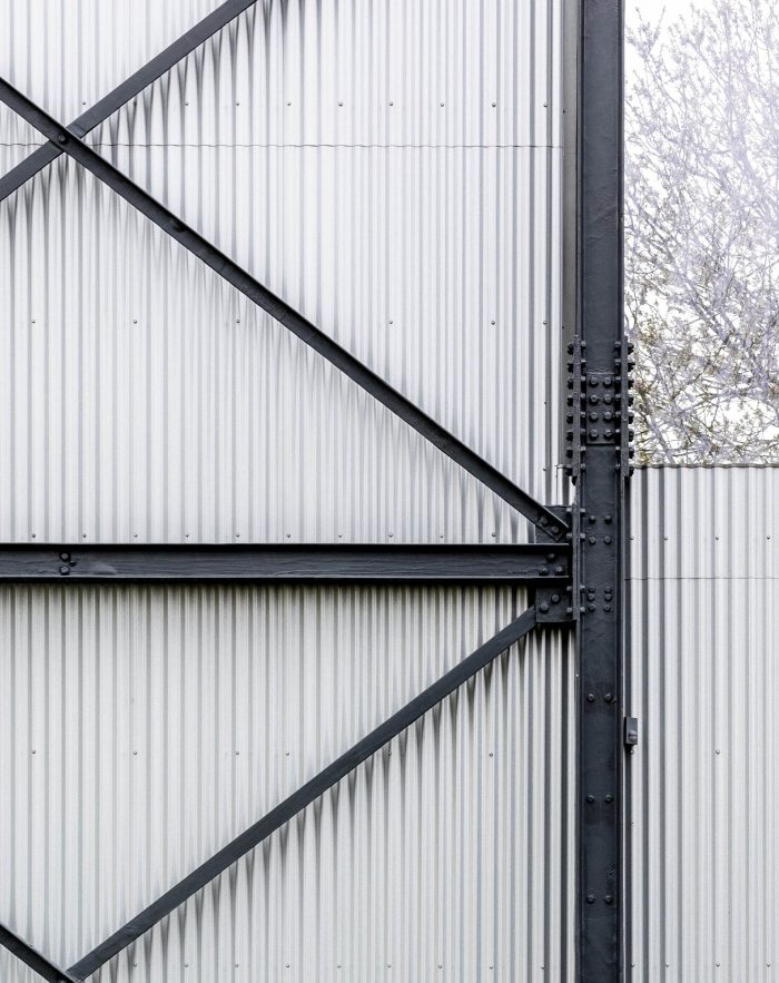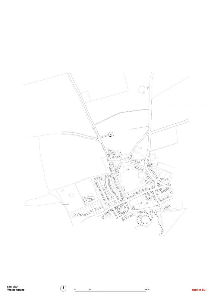 The water tower, a light and delicate frame that supports the heavy mass of a steel water tank above, acts as a landmark that marks the end of the historic village it previously served.