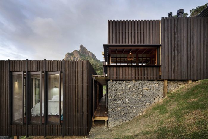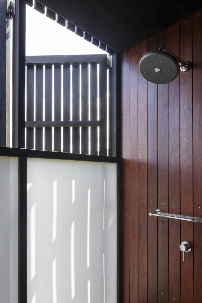 A black stained rainscreen cladding introduces a crenulated layering which peels open in part to allow views and privacy or wind screening. Structural timbers are generally exposed and left without color embellishment.