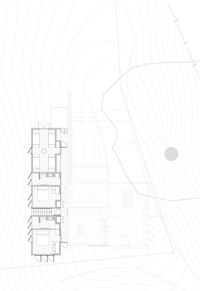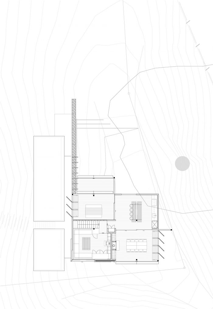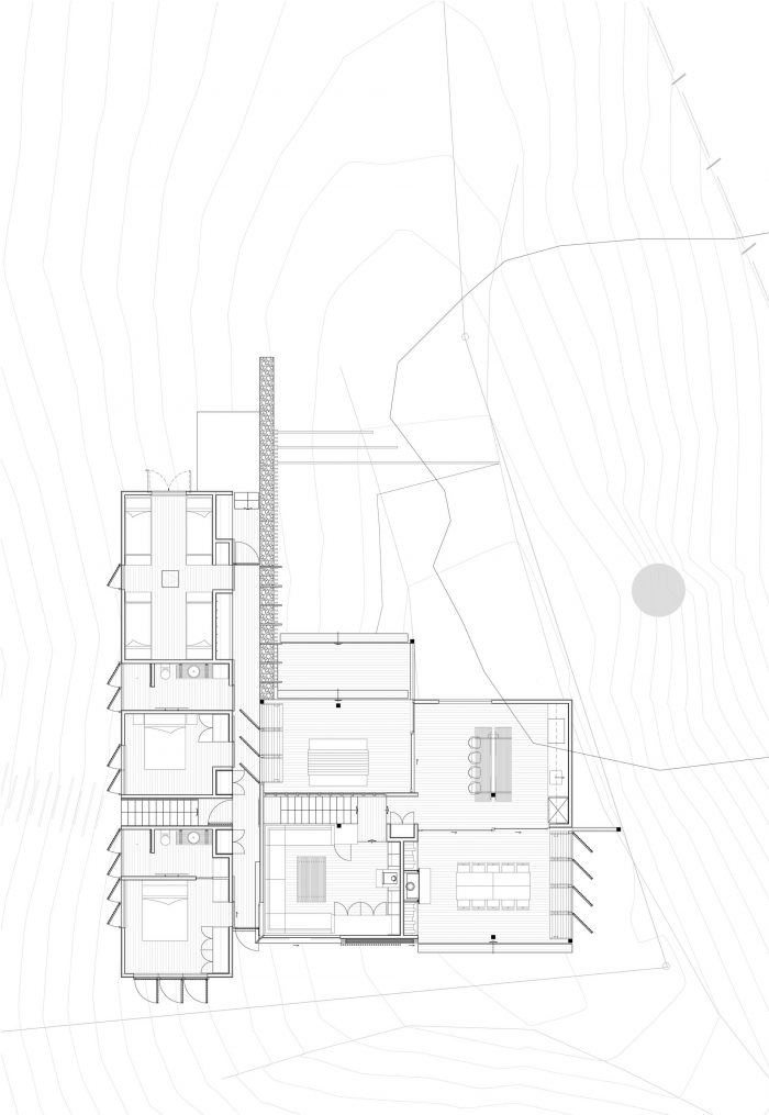 响应。 将建筑分成两个主要部分,以缩小规模,并让Bach顺着土地的轮廓。 在山丘上创造一个单一的切口,并用石笼网墙保留下来,这就建立了一个脊柱,各部分可以围绕这个脊柱进行排序。 将各功能区分开,以便从生活区看到全景,并将房子向海滩方向倾斜。 生活馆是由一系列的4个空间组成,呈风火轮状排列;一个厨房、一个休息室和两个有顶的露台。厨房根据当时的风向条件,通过操纵一系列的门和百叶窗,朝向北边和南边的甲板。 一个楼梯下降到低层,穿透了石笼网墙,一个有盖的外部走道沿着石笼网墙运行,连接到卧室空间。 楼梯在轴线上继续前进,在坡底有一个强大的岩石阵,使之与海滩连接。