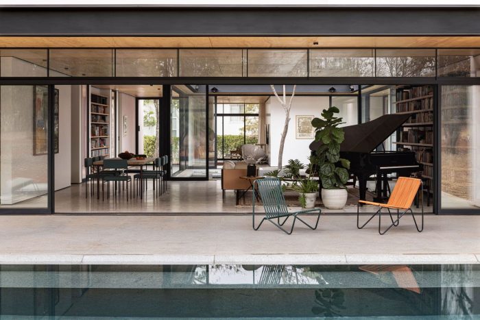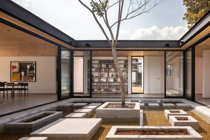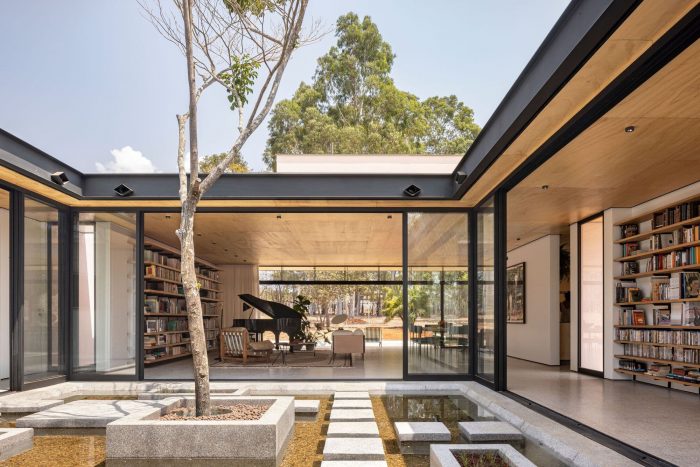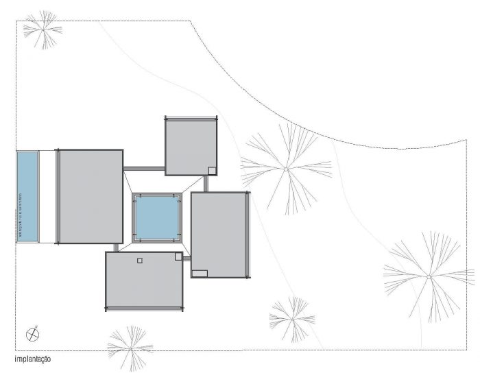 A variety of perspectives are revealed while walking around the house. It is possible to view the garden and the swimming pool through the great circulation of the main entrance. The separation of volumes allows the user to see the exterior when circling the courtyard clockwise and offers a spatial relationship either introspective or extrospective. To honor the "ancient residents", a native tree ' ipê' that inhabited the construction site, was replanted as a sculpture in the center of the courtyard. Natural light and air penetrate all directions thanks to the extensive full-height glazing with tippers. The courtyard is filled with paths, gardens, and water, which besides humidifying the house, reflects the sky and projects its movements inside.