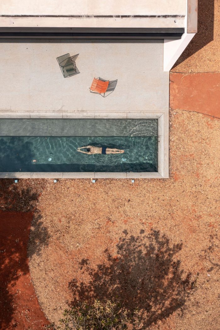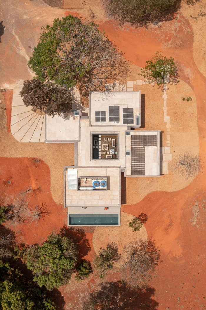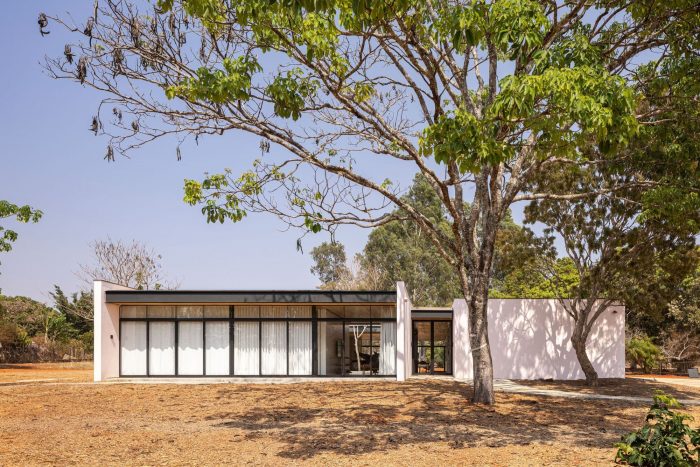 This simple house is implanted as a flower in the arid landscape of the Cerrado Biome, the Brazilian savannah. A couple seeking tranquility and connection with nature commissioned this urban refuge located 15 minutes from the center of Brasilia. The 2000 m2 plot made it possible to spread 375 m2 of construction through the land. Its volumetry consists of four loose volumes, drawn on a mesh of square modules and rotated around an uncovered internal courtyard, through which the volumes are interconnected.