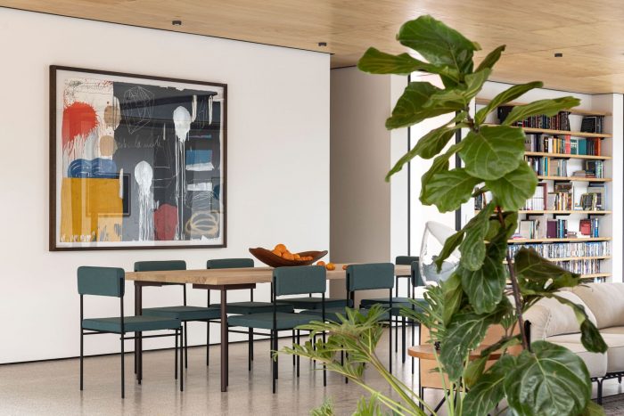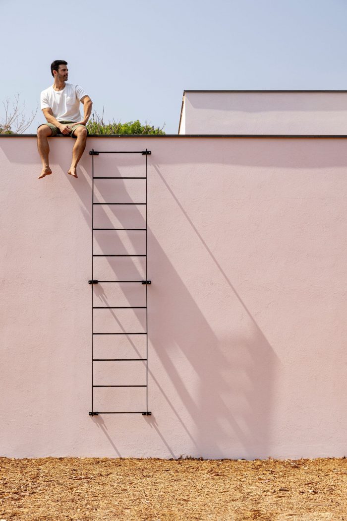这座房子是用低成本的材料和建筑方案建造的。通过混合结构,金属梁支撑着混凝土支柱。 外部砖石墙被涂成浅土色,与天空进行色差对话,而内墙是白色的,以突出艺术品和家具。水泥质地的地板覆盖了整个房子,除了潮湿的地方,被灰色花岗岩取代。衬里中使用的海军胶合板在厨房家具和为容纳居民的藏书而设计的书架上找到了连续性。