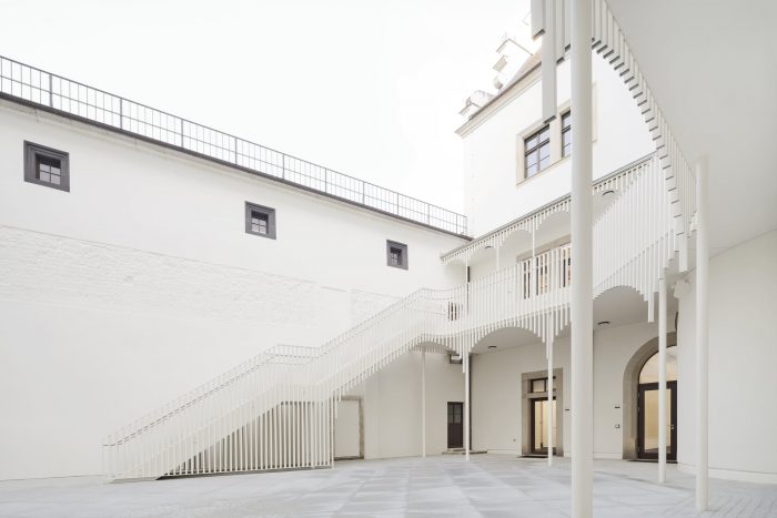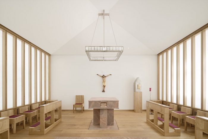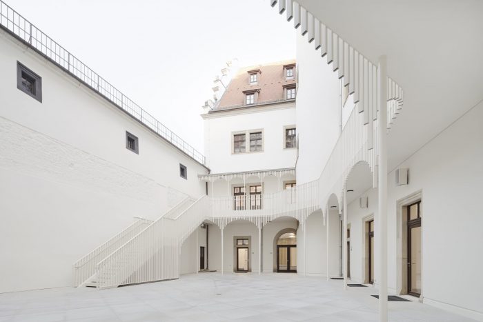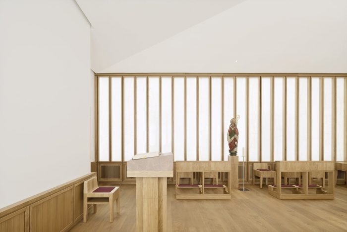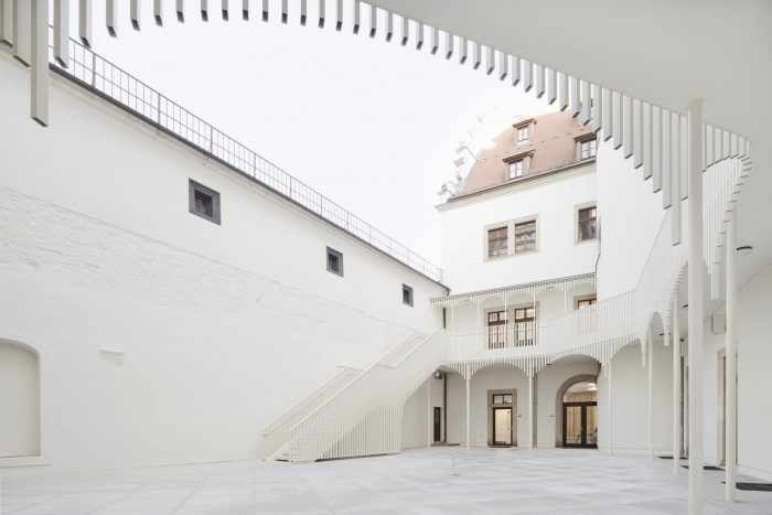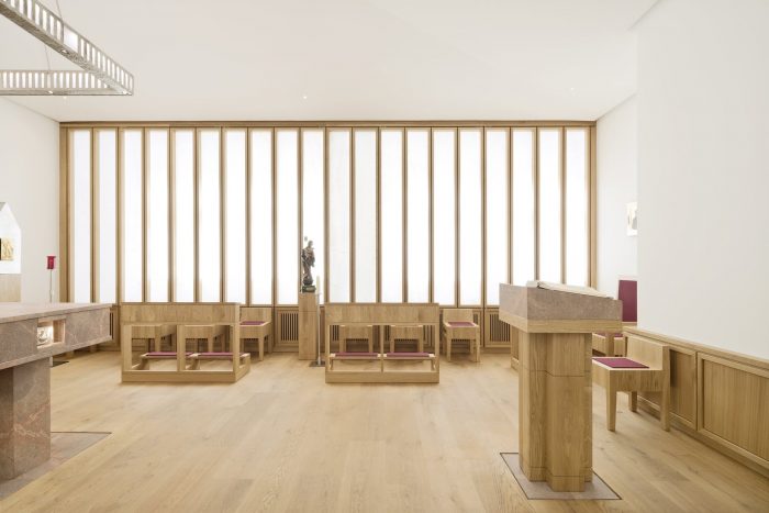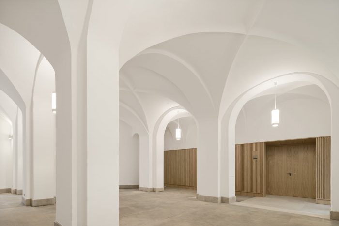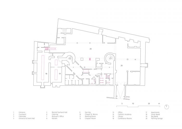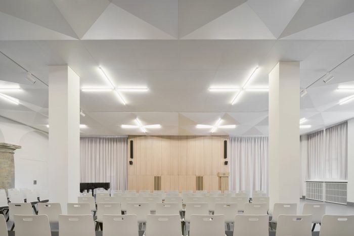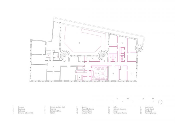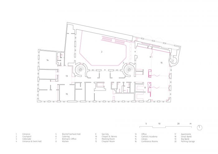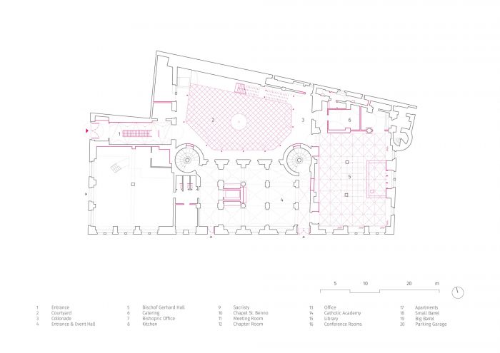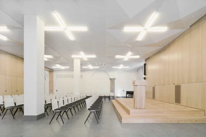 In addition to this reorganization, the room layouts of the event spaces were redesigned, a chapel was located in the core of the building as the new center and a dark hallway was upgraded as the new library and informal meeting place. The courtyard was redesigned as a semi-public, urban distribution and event space with all ground-level usages opening up to its walkway. The former vehicle access now serves as the new main entrance and thus aligns the House of the Cathedral with the public of the bustling Schlossstrasse.