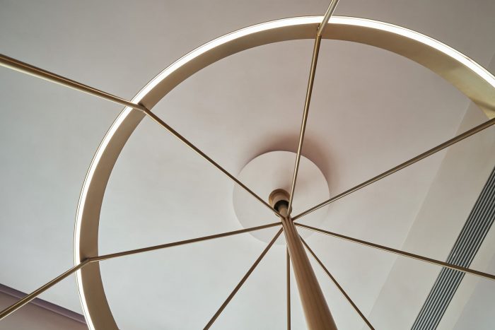 The first-floor space is the public area as a living room in daily life and for gatherings with friends. To display the owner’s collection, the rose gold stainless steel is applied to design the mobile shelves and other cabinets to serve as the delicate texture contrast to the coarse wall. The living room and dining room are clearly separated. However, the flow and the seat direction can increase the possibility of interaction between the two areas for the users. For the ceiling dome above the cooking area, the exaggerated style and pattern with their functions support the fun in the space and conceal the required equipment and piping.
