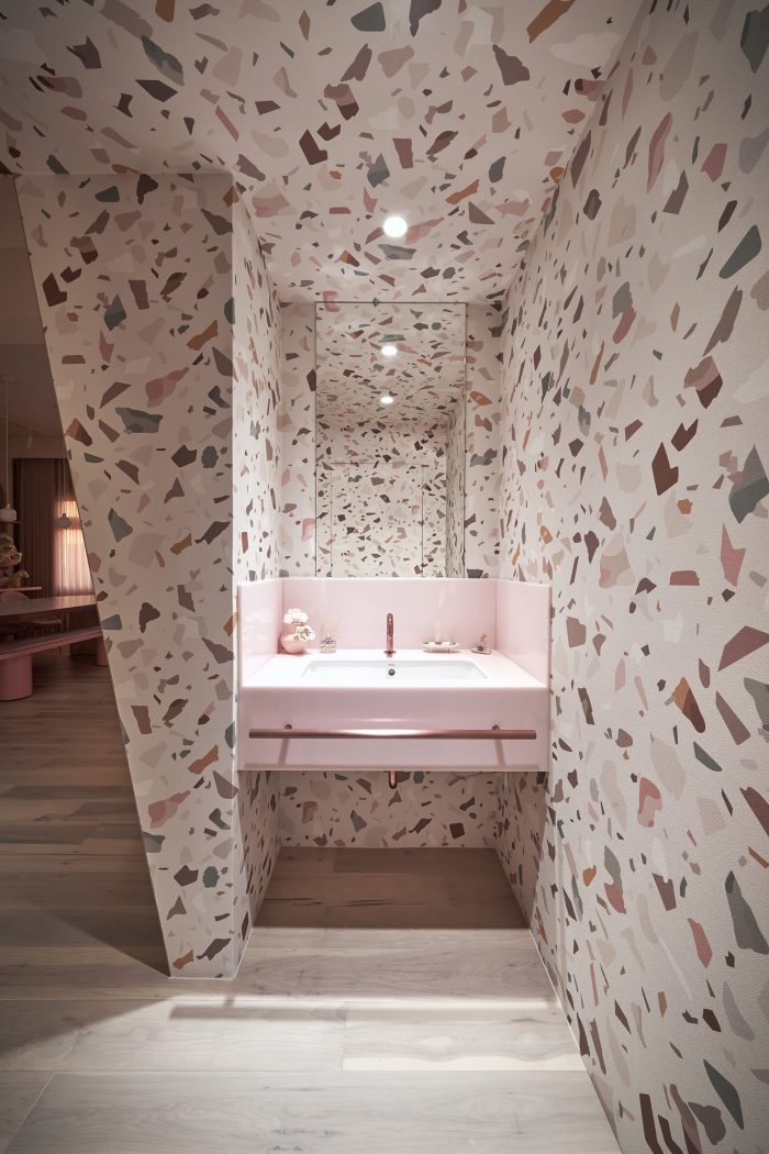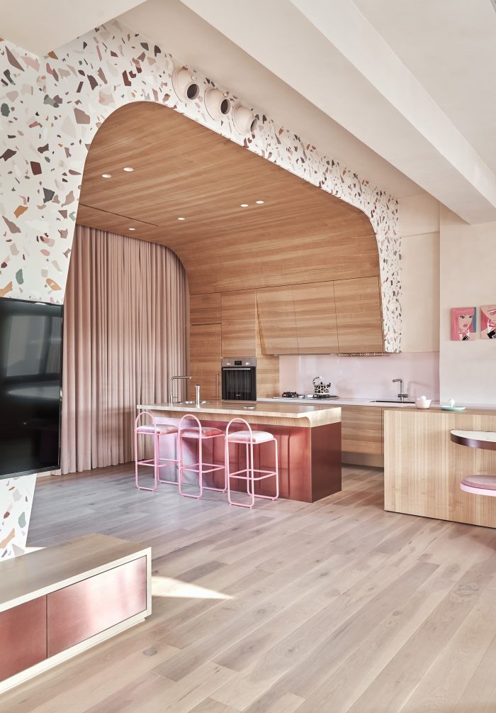 该项目是一个靠海的三层楼房。对于业主来说,这是一个可以放松的地方,在假期里和她的三只猫一起玩耍。为了建立一个纯粉色的空间,我们用粉色矿物漆作为墙壁和天花板的基础,并选择不同的粉色材料的自然颜色来组成混合风格。
