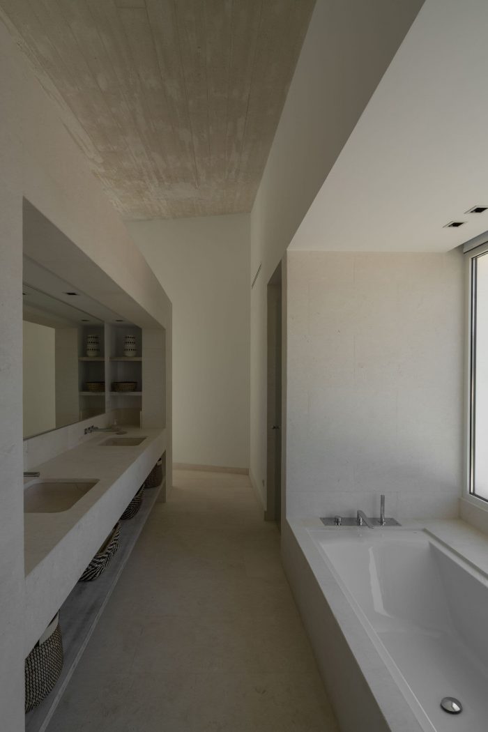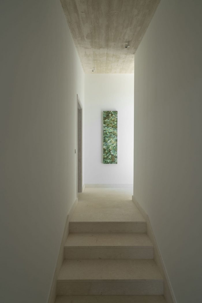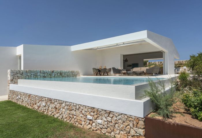 Regarding its materiality, the project alternates between two very characteristic materials of the island such as white mortar and dry stone walls, which together with the exposed white concrete roof and limestone flooring have a clear integrating vocation with the environment and history of the place.