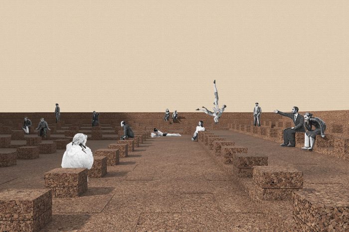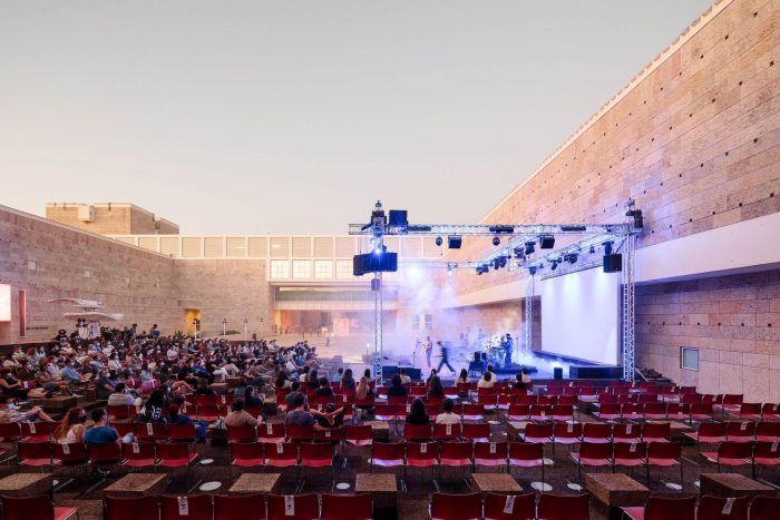 The amphitheater’s smooth slope lends an informality to the space and suggests the memory of southern landscapes. The vicissitudes of health rules were converted into a spelling where the marking of seats becomes a kind of new language.