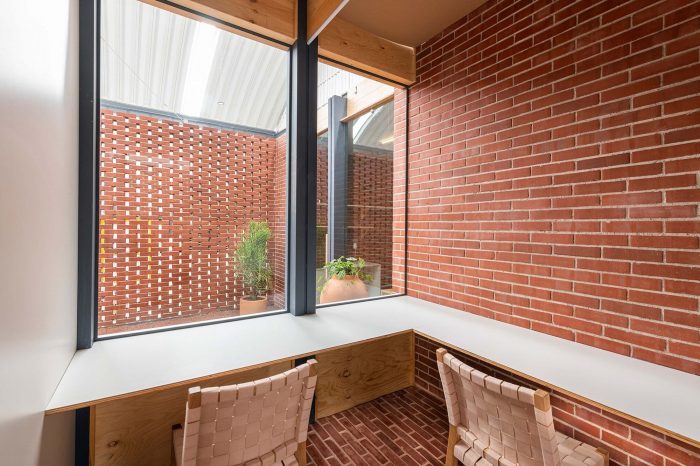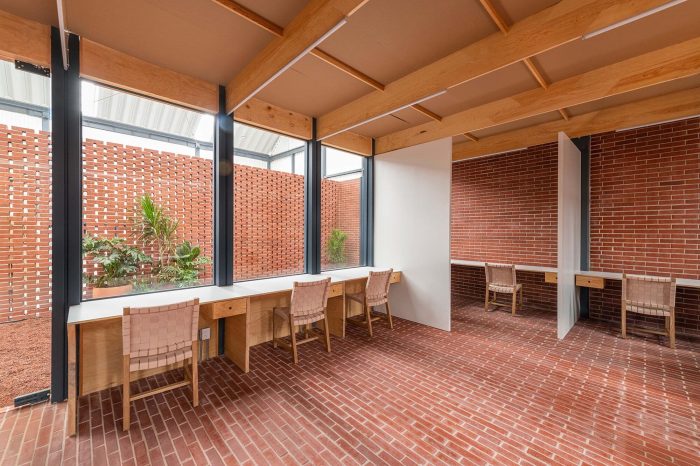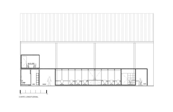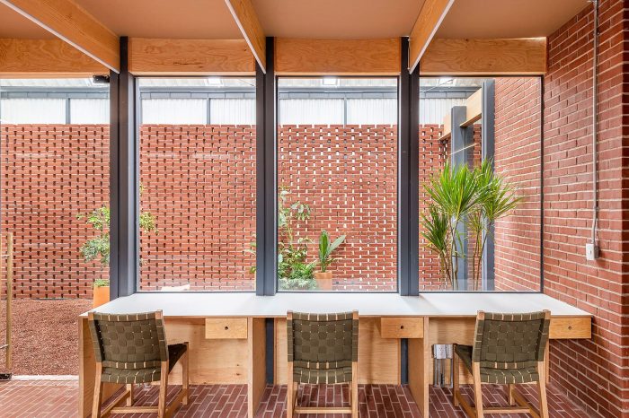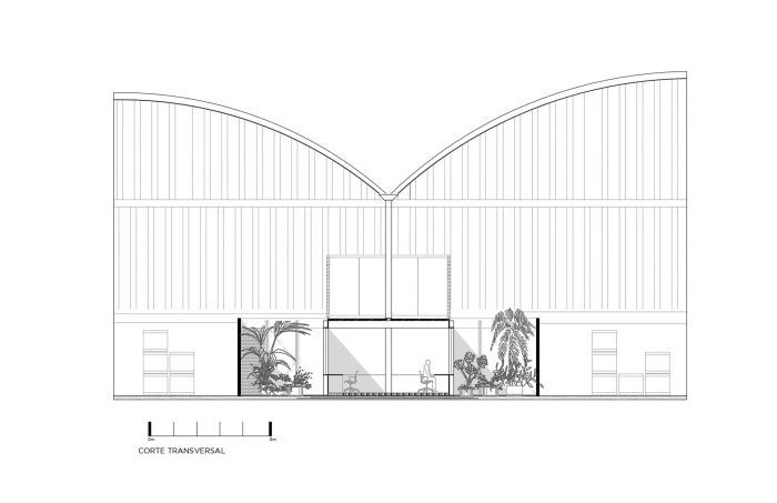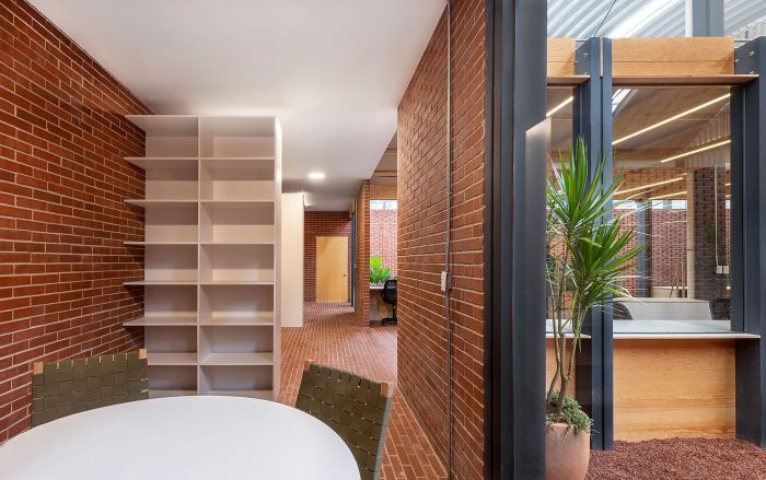Its materiality is represented by the brick in its natural tone, the wood, and the metallic structure. Brick has the great characteristic of being used as walls, pavements, generating blind facades, or latticework.