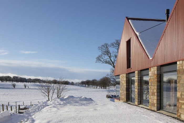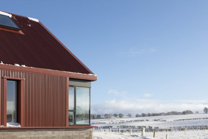 To keep running costs low, the house is highly insulated featuring triple glazing throughout, heat from an Air Source Heat Pump, super-insulated metal cladding, and a rainwater harvesting system. Externally, red sinusoidal cladding references the agricultural heritage of the site and the surrounding region, whilst reinforcing the presence of the house in the wider landscape. Reclaimed sandstone cladding was also used externally, further anchoring Ceangal House in its setting. The house is titled in relation to Scot’s Gaelic origins of the farm, the earliest operations of which have been dated by the family to the 1600s. The word ‘Ceangal’ is derived from Scot’s Gaelic meaning ‘to bond’.
