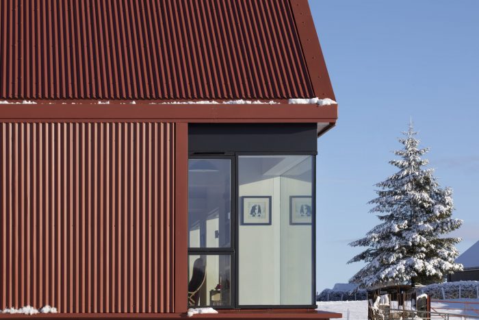 Volume is central to the design principles in play at Ceangal House. The house is characterized by three pitched red gables increasing in volume from east to west act, which offers both visual interest and generous interiors. Inside, these volumes accommodate a lobby, kitchen, dining, living room, and reading room, with a guest bedroom contained on the first floor of the largest gable. The north-south wing contains the children’s bedrooms leading to the master bedroom at the northernmost part of the house.
