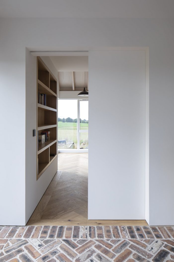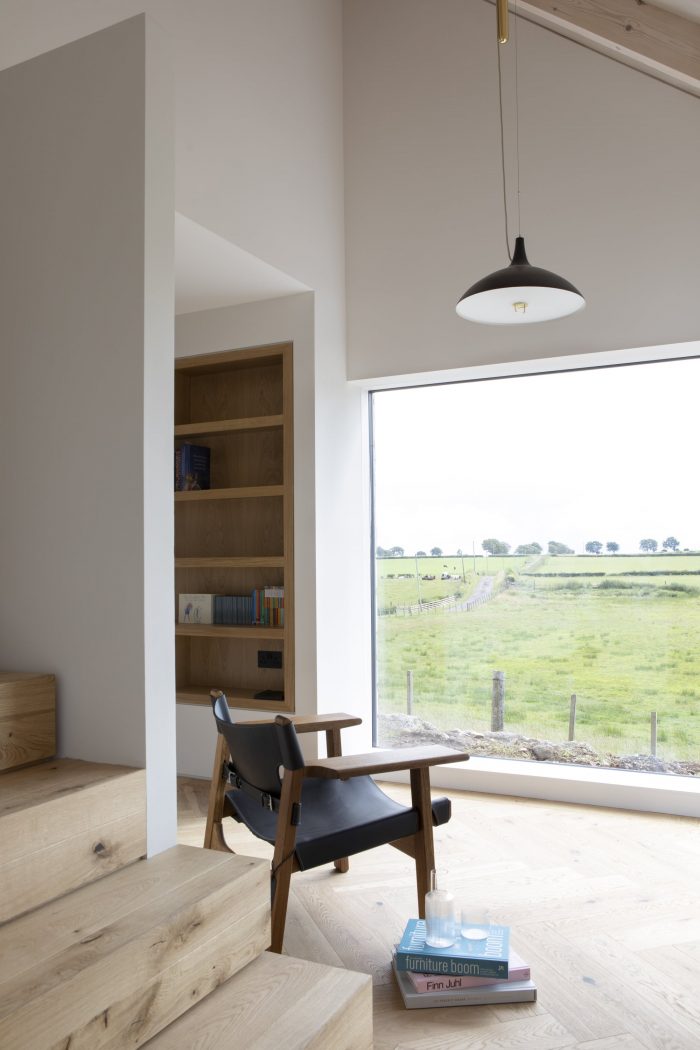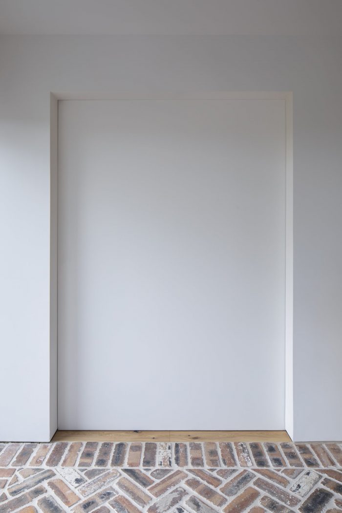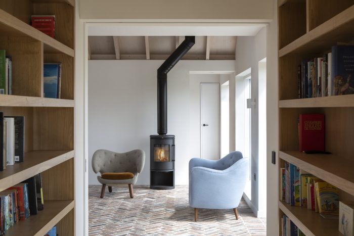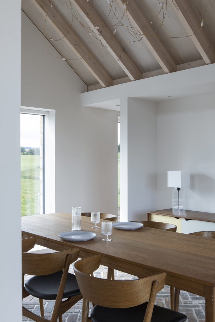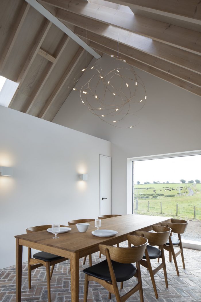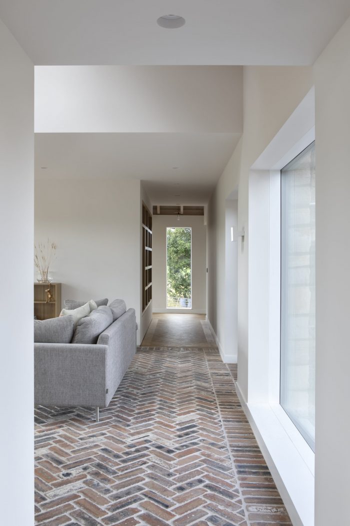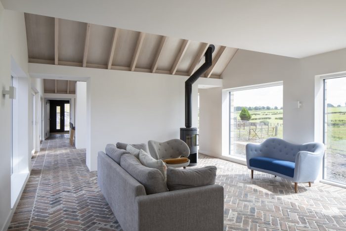 Large expanses of triple glazing allow the house to experience the changing seasons of the site along the southern elevation. In line with Loader Monteith’s rigorous approach to sustainability, 90 percent of the original masonry from the old steading was reclaimed and used throughout the home. The clients hand-cleaned and reclaimed over 4000 locally-cast bricks which were used to lay a herringbone floor throughout, grounding the new house in its place. Loader Monteith overcame the technical challenge of incorporating underfloor heating beneath the layer of thick brick by digging deep foundations of 90 centimeters. This solution allows the expansive brick floor to act as a thermal store for heat throughout the day and gently radiate warmth overnight.