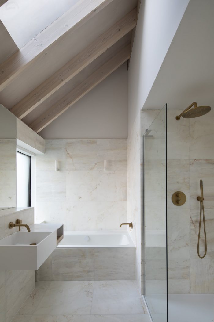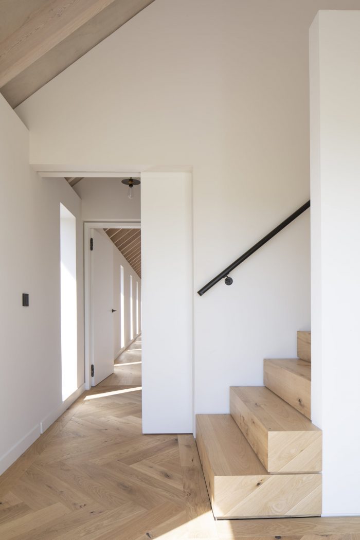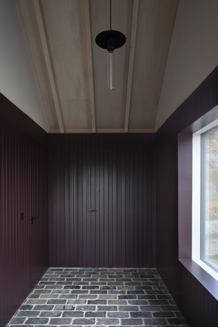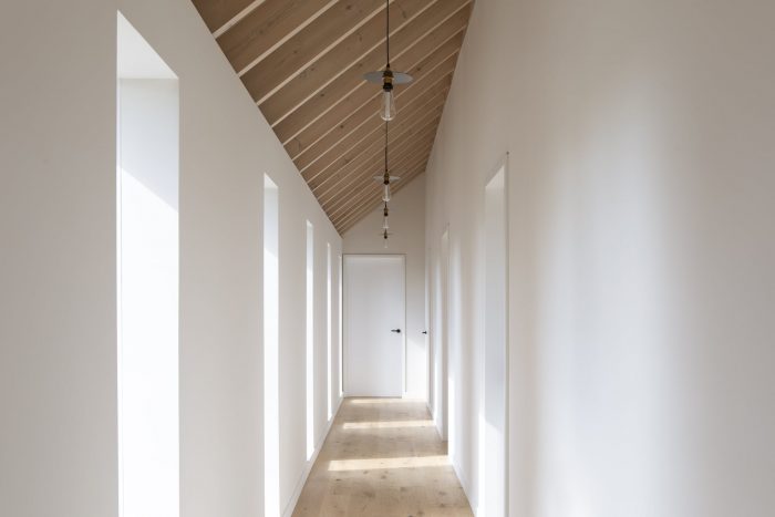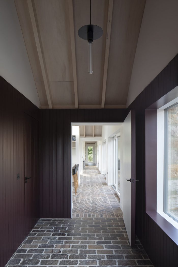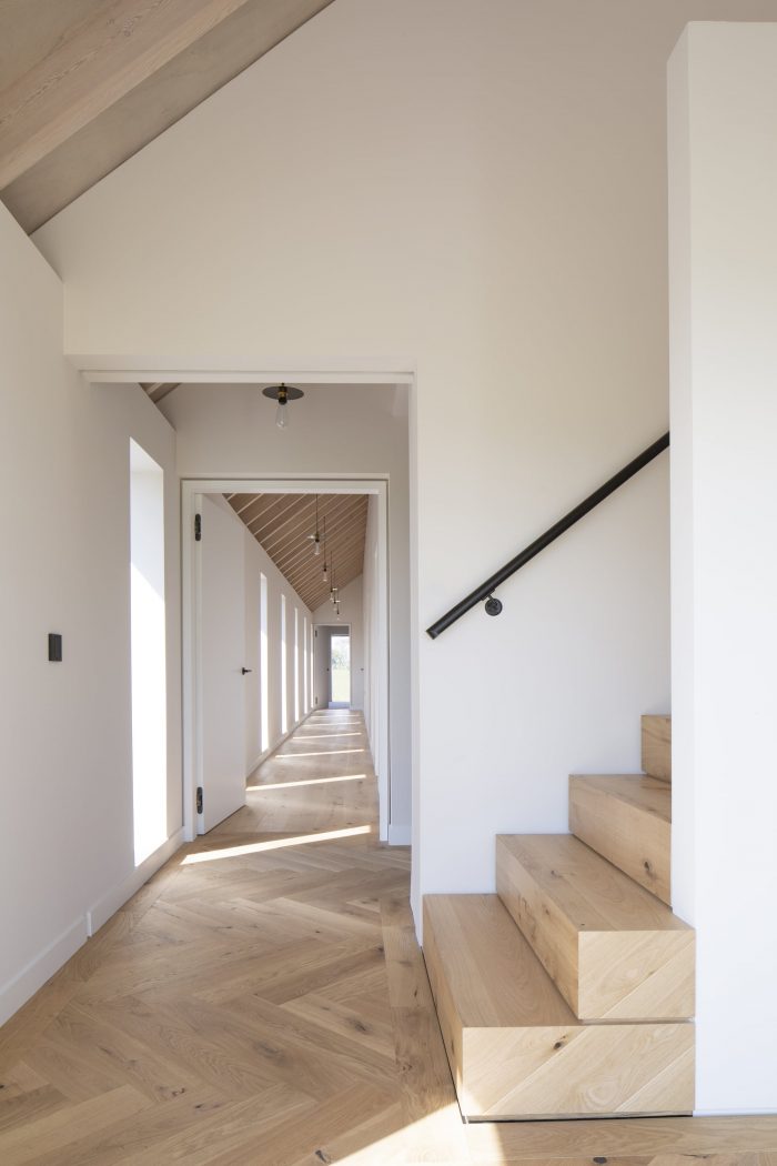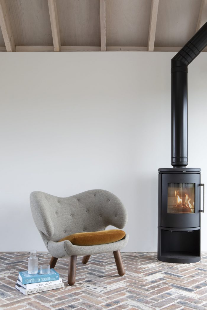 Large expanses of triple glazing allow the house to experience the changing seasons of the site along the southern elevation. In line with Loader Monteith’s rigorous approach to sustainability, 90 percent of the original masonry from the old steading was reclaimed and used throughout the home. The clients hand-cleaned and reclaimed over 4000 locally-cast bricks which were used to lay a herringbone floor throughout, grounding the new house in its place. Loader Monteith overcame the technical challenge of incorporating underfloor heating beneath the layer of thick brick by digging deep foundations of 90 centimeters. This solution allows the expansive brick floor to act as a thermal store for heat throughout the day and gently radiate warmth overnight.