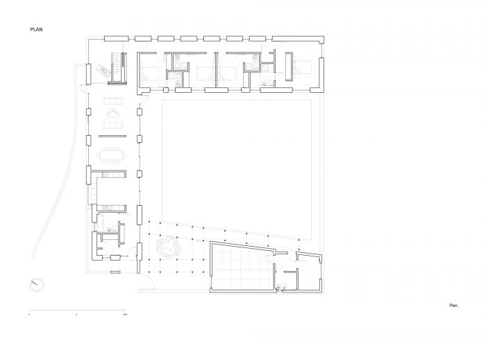 建筑师设计了一个庭院式住宅,呼应了原来的小木屋的语言,组织成L型,以提供对苏格兰无情的风景的庇护。一个新的木头包覆的办公室和客人工作室位于西部边界,通过一个红色铝和木头凉棚与主屋相连。