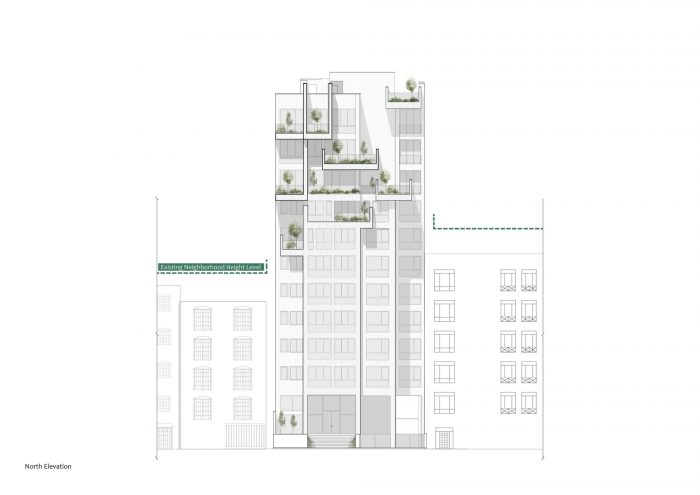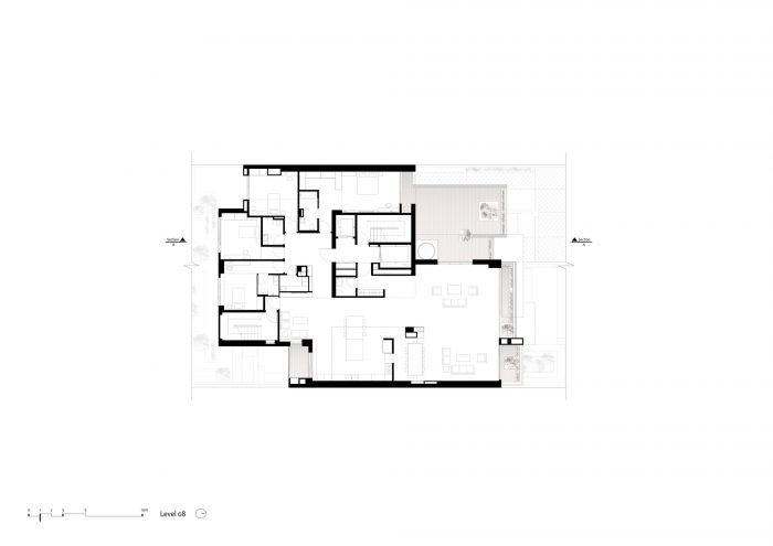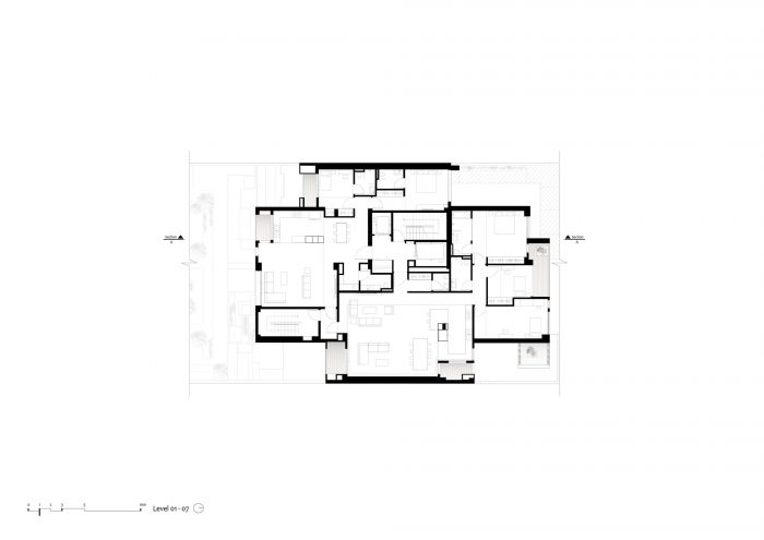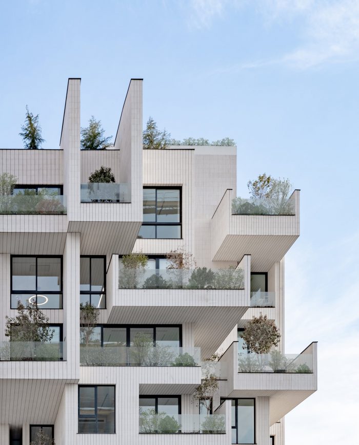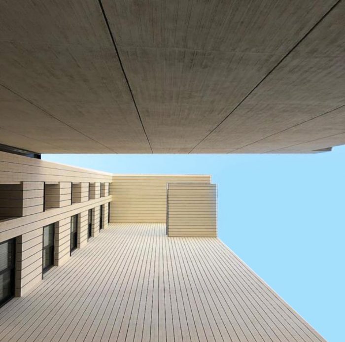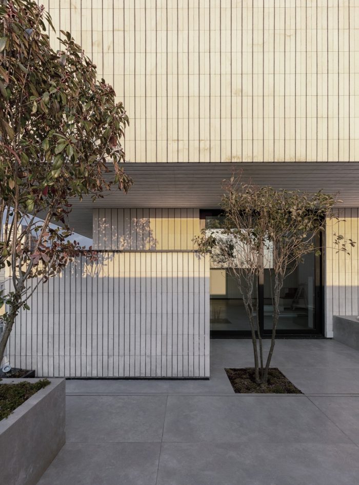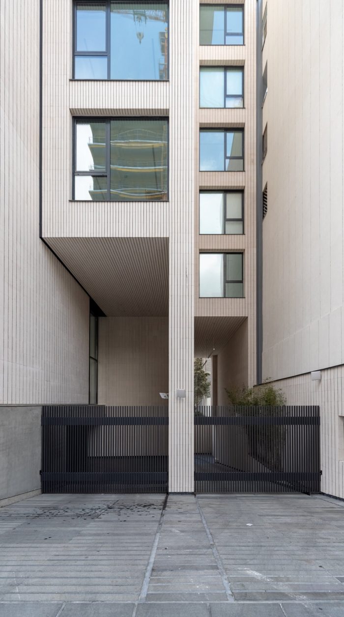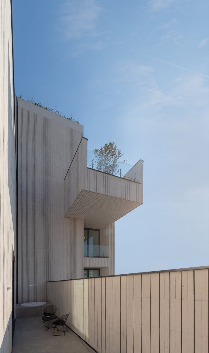 该建筑遵循类型学,直到相邻建筑的高度,在此之上,通过改变计划,张力和对比从窗户的形状和轮廓开始,直到最终在露台和控制台蓬勃发展。该类型的建筑试图通过多层次的体量设计、条形外墙以及露台的位置和建筑中使用的材料来解决第三个立面的问题。在立面上,砖被用作建筑的主要媒介,构造意图和审美表达。砖块在每个体量的外墙条纹上创造出不同的图案,通过一些线条,它们形成各种间隔和纹理,很容易区分。