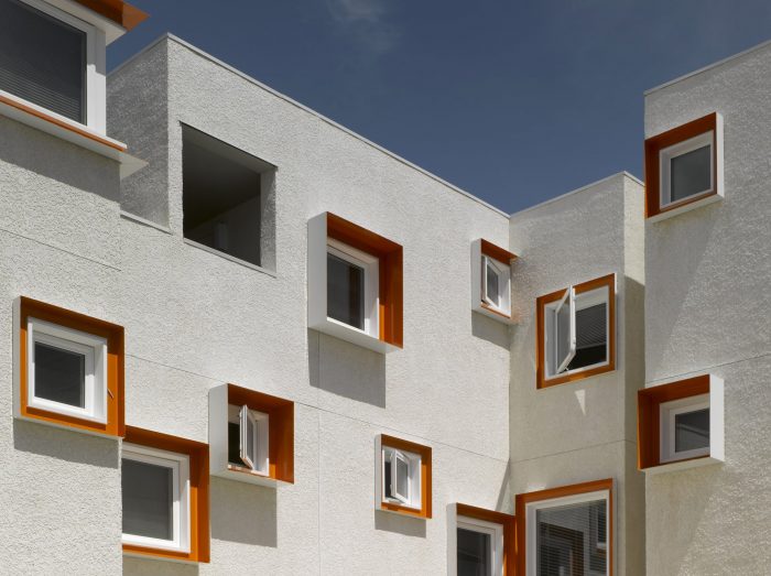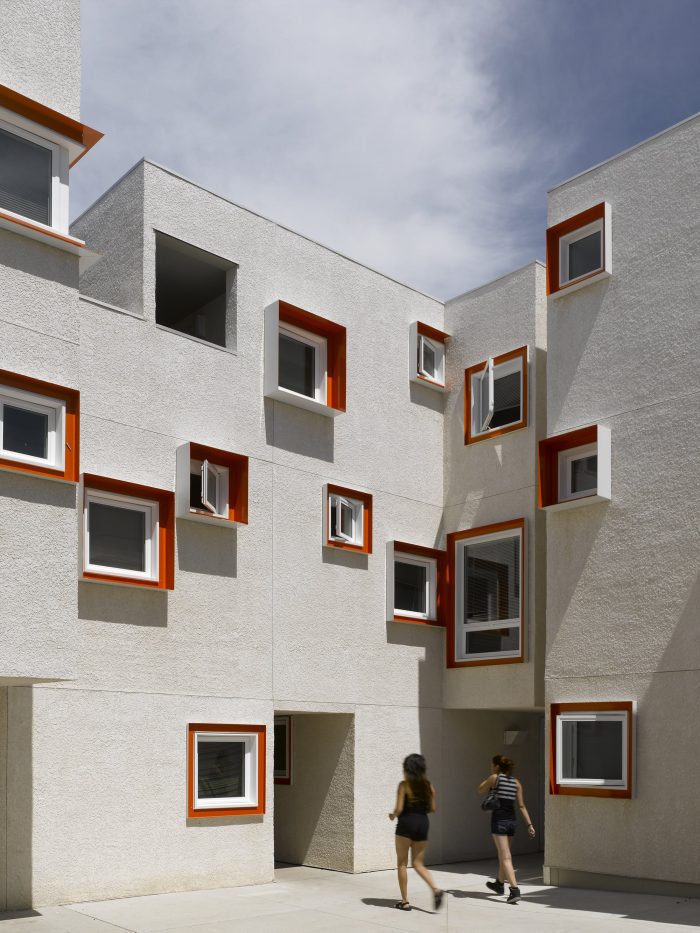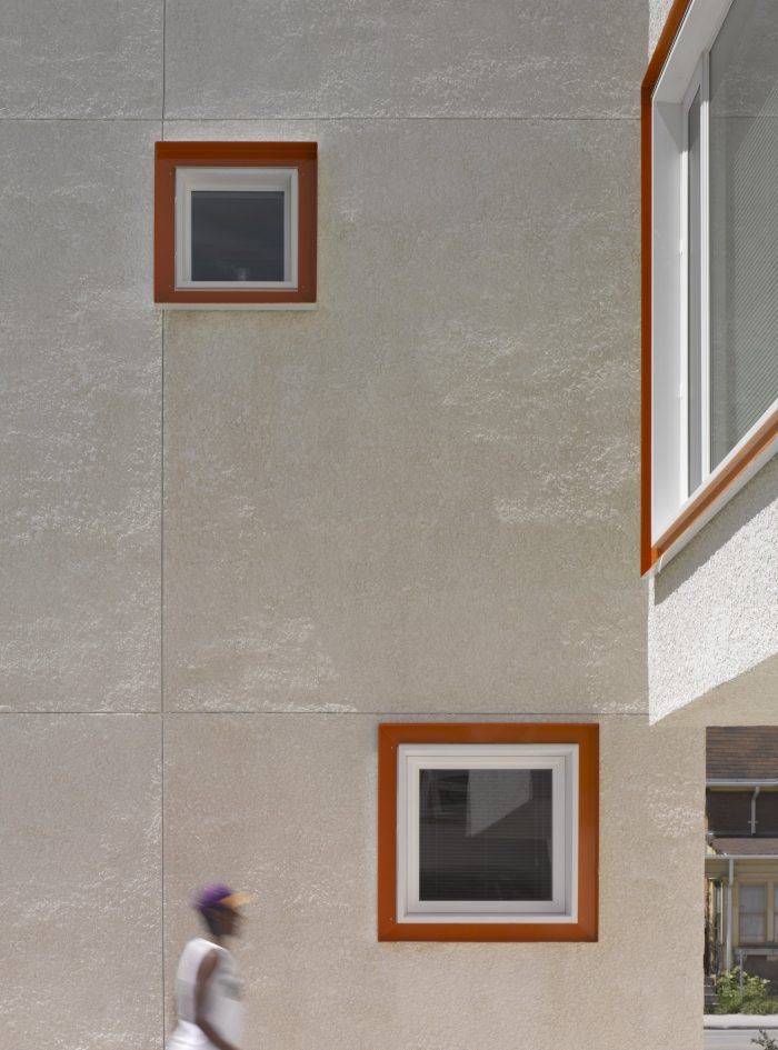 With entries and windows positioned on all sides of the blocks, there is no rear side to this project, thus improving the street quality and safety and security in all directions. Further, a typical residence has eight or more windows on at least two sides of the building, providing ample and varied access to views, daylight and cross-ventilation. Deeply set, vibrant orange cowlings around the windows modulate privacy and views into the units, granting Centre Village a distinct identity in the city. With time the project is demonstrating how inventive architecture can influence urbanism and positively impact social relationships.