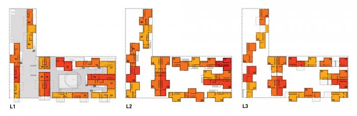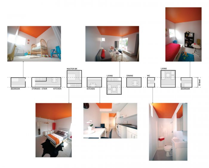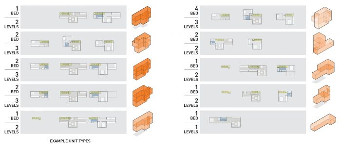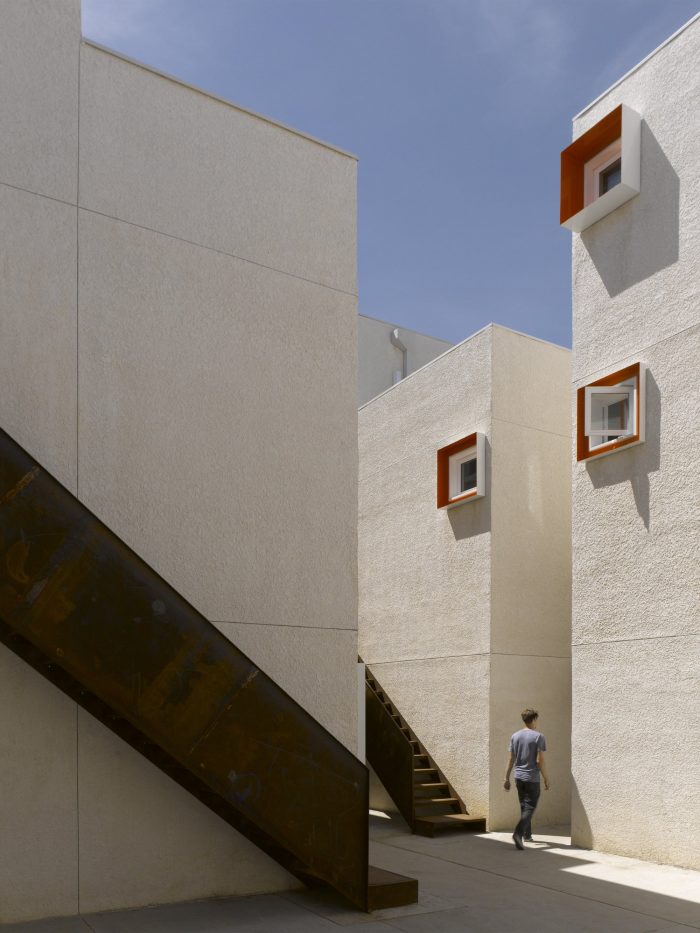 Designed to make the most of space, material and daylight, the units have rich and playful compositions made from compact 8'x12' modules and cantilevered 14’ x 12’ modules for larger living areas that offer broader views. The modules are stacked and interlocked to create diverse unit configurations that vary from 375 square feet for a one-bedroom unit, to 875 square feet for four-bedroom units. Since the rooms of each unit are distributed over several floors, even small apartments have plenty of privacy, which was an important factor since a number of the tenants are multi-generational families.