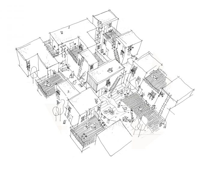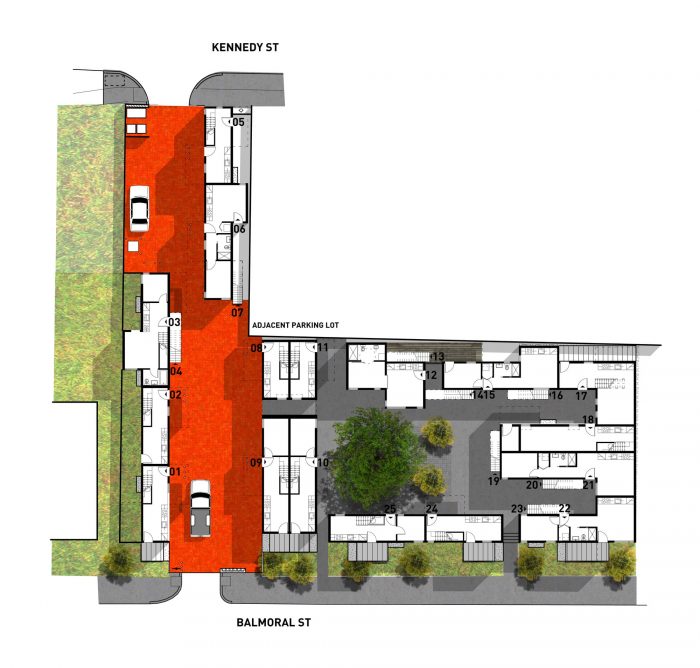 The site was an abandoned L-shaped lot zoned for six single-family houses. Instead, the project established a micro village of 25-dwellings within six, three-storey blocks that would be easy to build and maintain. The blocks’ arrangement both defines and animates two public spaces – a through-street and a shared courtyard – that weave the city through the project and provide amenities for residents and the surrounding neighbourhood. The landscaped courtyard offers a calm and protected place for children to play, and the new street is an informal meeting place. Each dwelling has its own entrance, either at grade or up an exterior staircase, thus reducing internal circulation and the size of the overall building, and also prompting residents to connect and get to know one another.