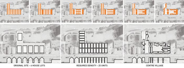 中心村的主要可持续发展举措是在特定场地上的三层联排别墅类型中实现的单元密度。然而,如果解决方案不适合居住或影响空间的质量,那么密度本身就不是创新。原本是六块单家独户的土地被合并,以创造出客户所要求的25个住宅的场地,这是客户所要求的单位数量。四倍的密度有可能填满整个地块,没有共享的社区空间,没有单元的呼吸空间,甚至没有足够的墙面面积用于窗户,这将使内部和外部空间都不适合居住。