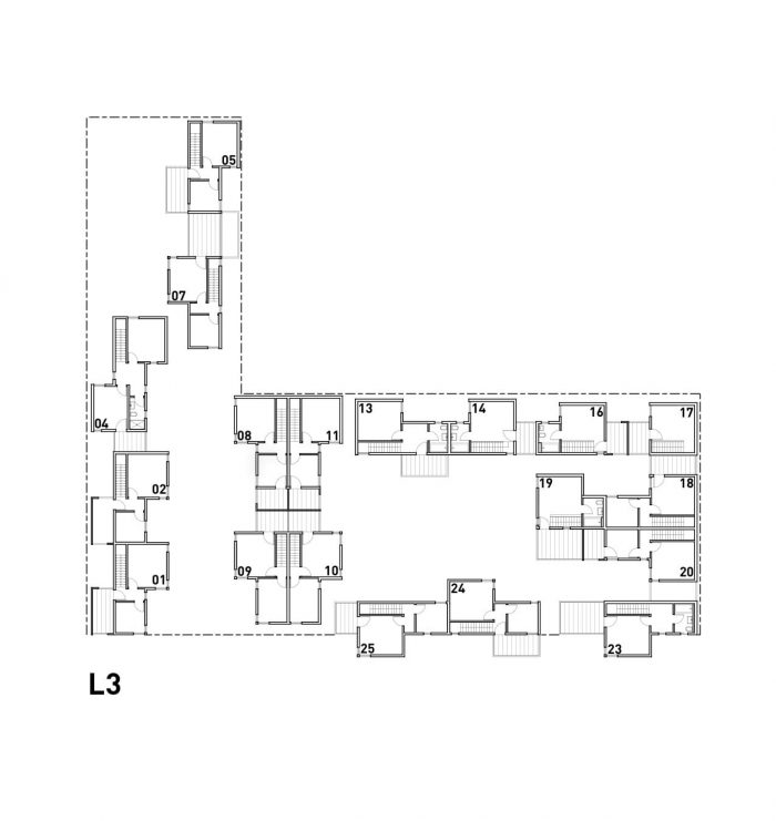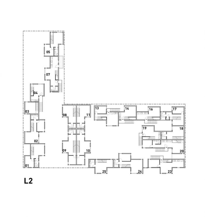 该地块是一块废弃的L形地块,被划为六栋单户住宅。相反,该项目在六个三层楼的街区内建立了一个由25个住宅组成的微型村落,易于建造和维护。这些街区的安排既定义了两个公共空间,又使其充满活力--一条通衢大道和一个共享庭院--将城市贯穿于项目之中,并为居民和周围的社区提供便利设施。景观庭院为孩子们提供了一个平静和受保护的玩耍场所,而新街道则是一个非正式的聚会场所。每个住宅都有自己的入口,或在地面上,或在外部楼梯上,从而减少了内部流通和整个建筑的大小,也促使居民相互联系和了解。
