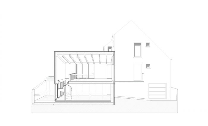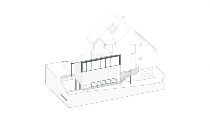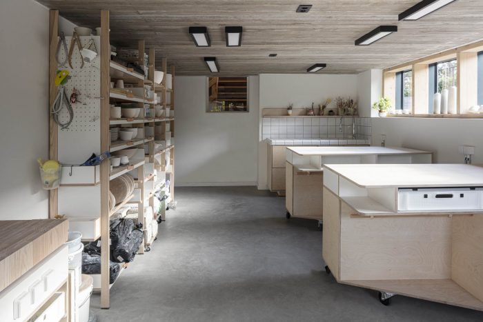 A ceramics studio for Vera Stoefs, an experienced ceramics artist. As a light filled space close to home the new pavilion merges into an existing corner of the house, slides into the natural slope, like a garden chamber in service of craftsmanship.