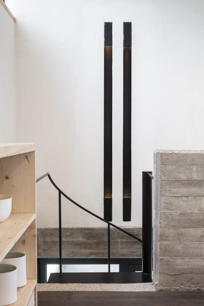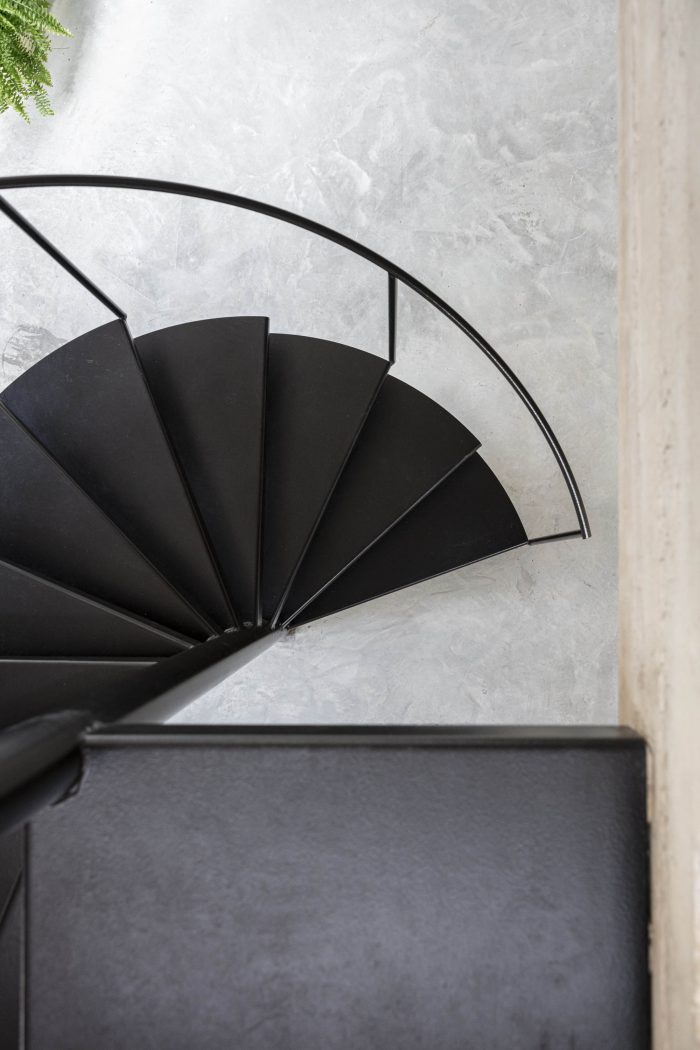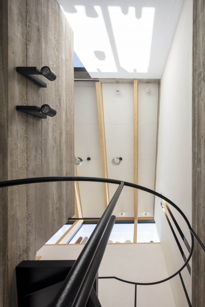 Descending along the spiral staircase the studio becomes a place for production. An inner courtyard encourages working outside. From this workspace Vera observes the visitors passing by over the steel walk way.