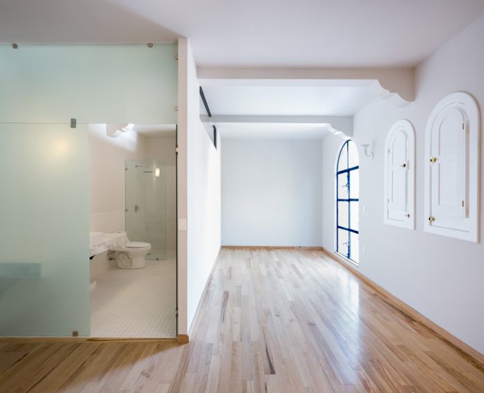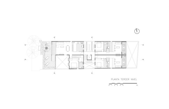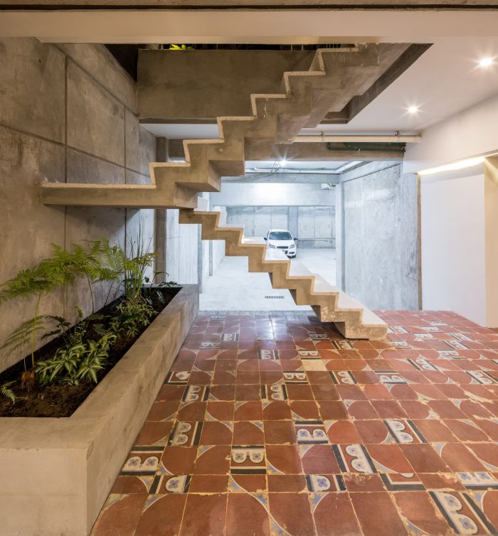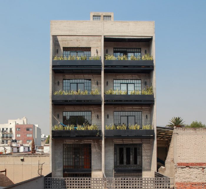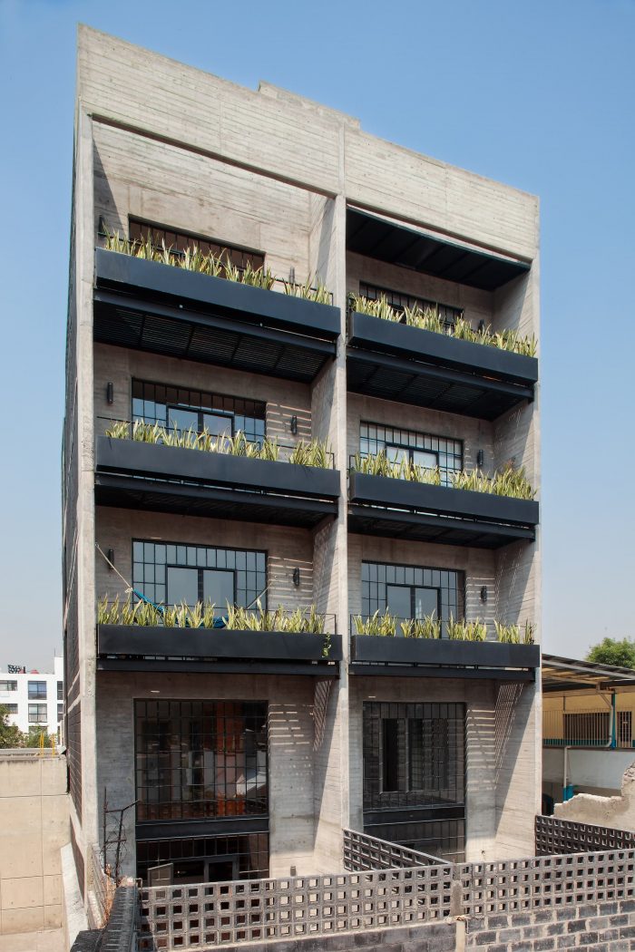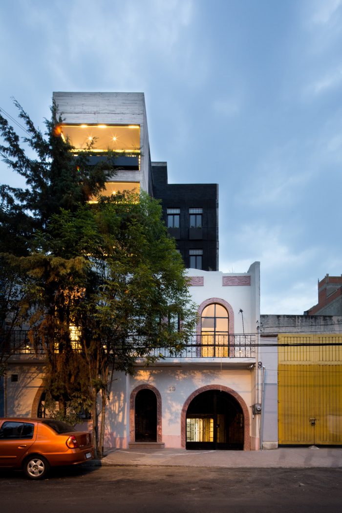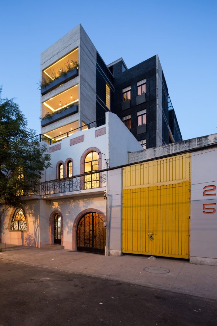 The project is located in an area of 343 m. with a trapezoidal shape and an east-west orientation. The challenge of this project is to preserve its original façade built in the 1940s by the INBA. And achieve a vanguard building for housing use. The building consists of two volumes of 5 levels and a semi-basement parking, on each level there are 3 duplex homes. The volumes are separated by the circulation volume that distributes the access to the houses through a corridor with two courtyards up to triple height.