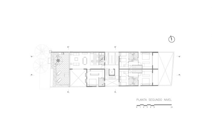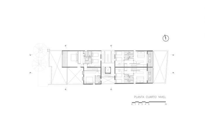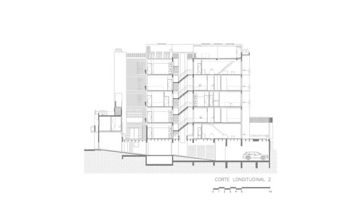 建筑物的开口从地板到天花板,矩形比例为1/2.5,产生了一种节奏,并配置了立面的发展,建筑物在其最长的一面(南向)使用了照明和通风,每个体积的末端都有开口,还有一个天井,保证了交叉通风,这是可能的,因为相邻的财产没有开发,将来也不会,因为它是一个地铁设施。