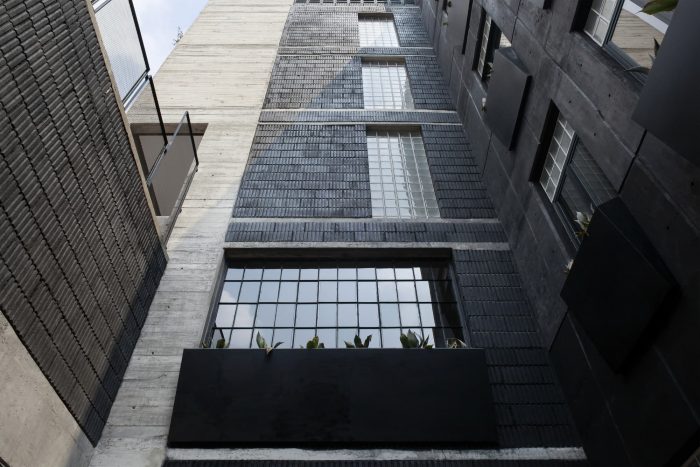 The openings of the building go from floor to ceiling with a rectangular proportion of 1 / 2.5 that generates a rhythm and configure the development of the façade, the building uses the lighting and ventilation in its longest side (south orientation) with openings at the end of each volume, and a patio that warranties cross ventilation, this is possible since the adjoining property is not developed and will not be in the future since it is a Metro facilitiy.