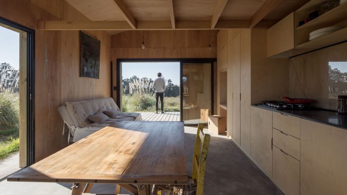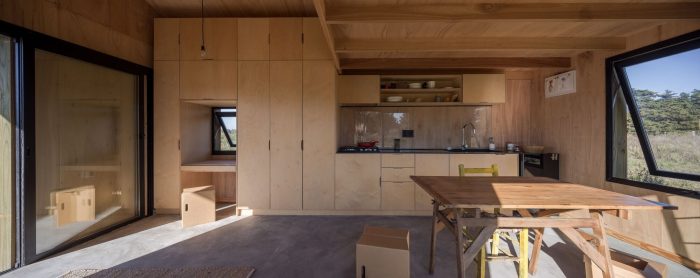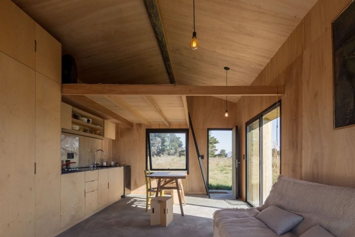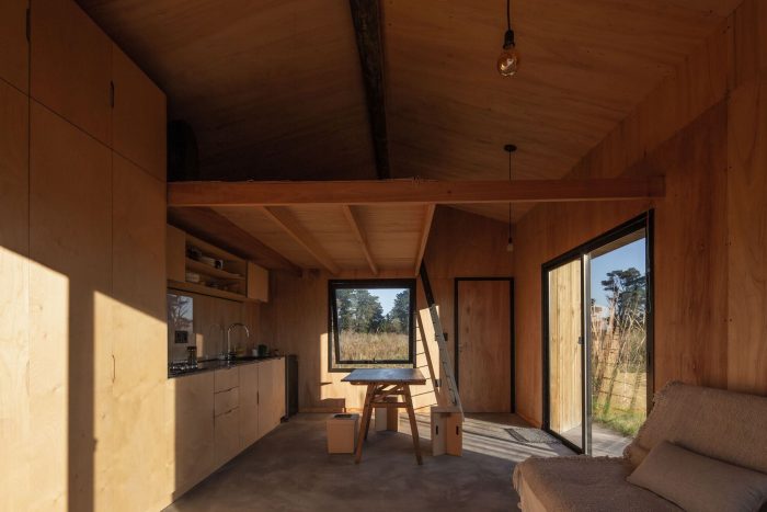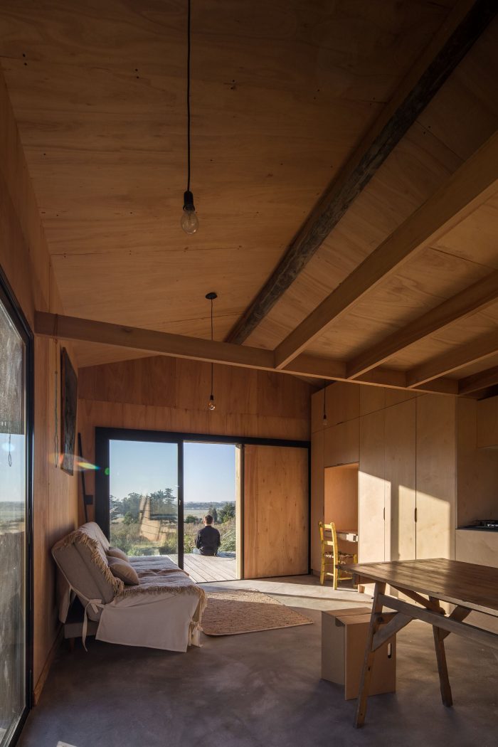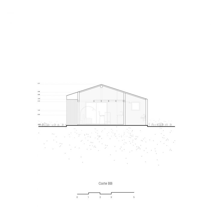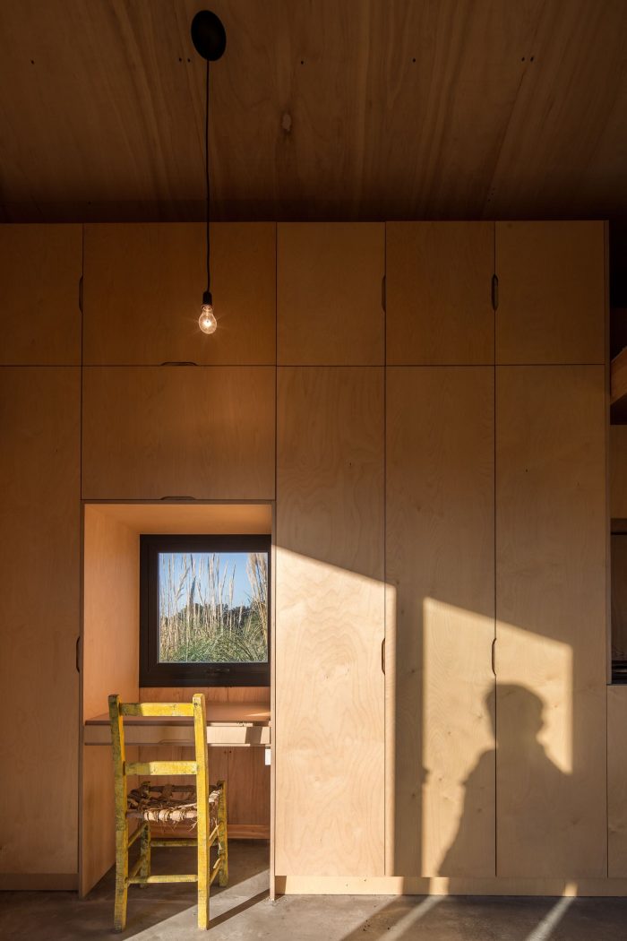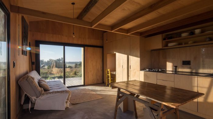 The interior distribution is articulated from an equipped wall containing the kitchen, pantry, and desk that would provide the flexibility to operate in a home office format. On a mezzanine above the dining room was located the resting area with the bed and closet spaces. Finally, it was decided that the access to the services would be outside in an attempt to put in value the Uruguayan rural identity by rescuing in this contemporary piece the old typical functioning of the country houses of our country.