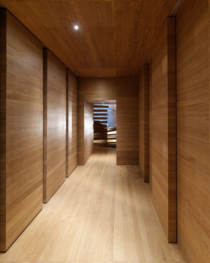 They are simply planted into the practically unchanged hill in the middle of a wide alpine meadow. Visitors approaching the building by car or on foot first arrive in the elevated courtyard with its reflecting pool. The corresponding sauna/wellness area, located at street level, is protected from the prying eyes by a wood-paneled courtyard. Cars and people disappear into the underground entrance concealed by the hillside.