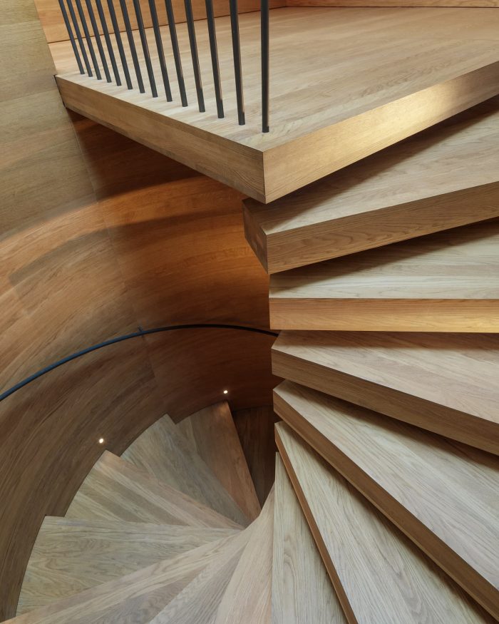 The concept dematerializes their structural link to the point of zero, the two rooms being connected instead visually by the space-defining rows of full-height windows and doors on the slope side. The various staircases - spiral and single-flight staircases - respond to the arrangement of rooms and function and set the stage for contemplating the sculpture and its symmetry on a walk-through along the diagonal. Small light wells at the top of the stairs and a skylight above the stairwell reinforce this effect.