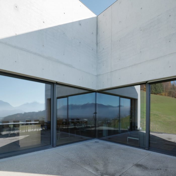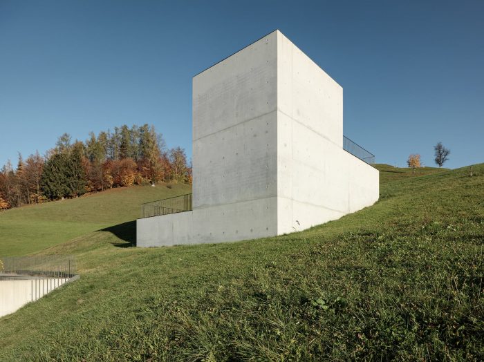 Positioned on a steep hillside along the northeast edge of the settlement, the House of Chambers lays the Rhine Valley directly at your feet. Surprisingly compact, even monolithic, the spatial sculpture digs its way into the slope: a cube and a courtyard in the middle of a wide alpine meadow.