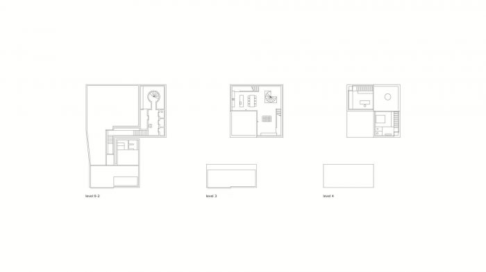 The floor plan is based on 4 quadrants of a square = square squared. Three of these are enclosed by monolithic concrete walls, whereas the fourth quadrant is a southwest-facing terrace. The living area on the first aboveground level enjoys afternoon and evening sun. On the higher bedroom level, the building moves in the opposite direction, with the two remaining spatial units also encircling a terrace, but this time to the northeast. The two 'chambers' touch at the 'zero' line on the z-axis.
