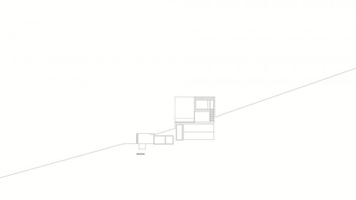 The exposed concrete house dispenses with the recent usual customary strategies of houses with sculptured gardens, retaining walls, and terraces and makes a powerful counterargument: a house, a hillside, a courtyard. The powerful ensemble of cube-shaped houses and entrance courtyard, wedged into the hillside, solves all these tricky slope issues with just these two figures stamped into the landscape.
