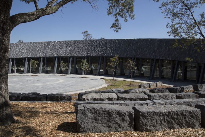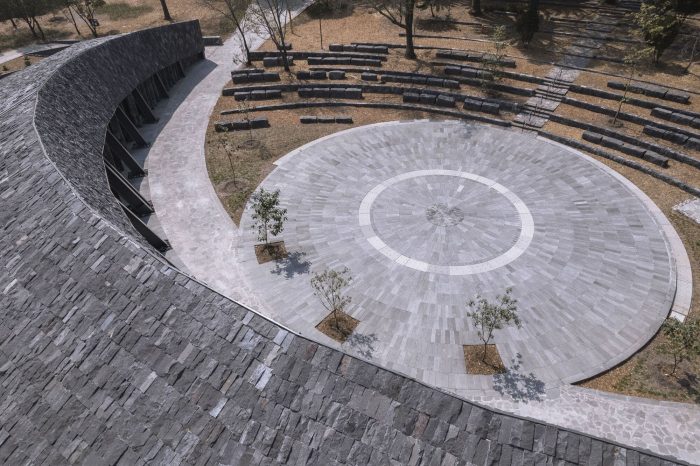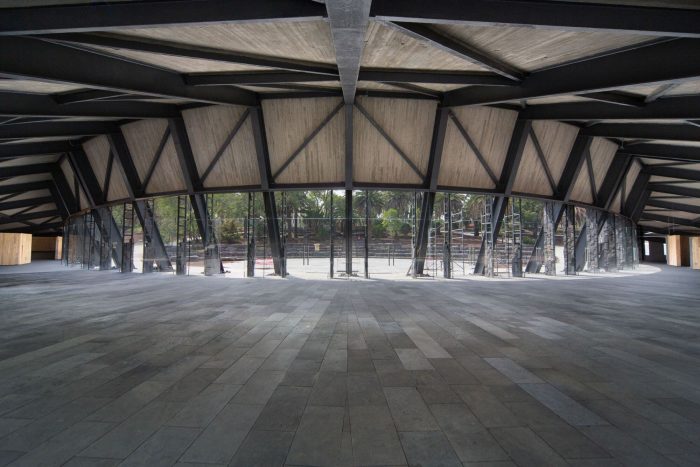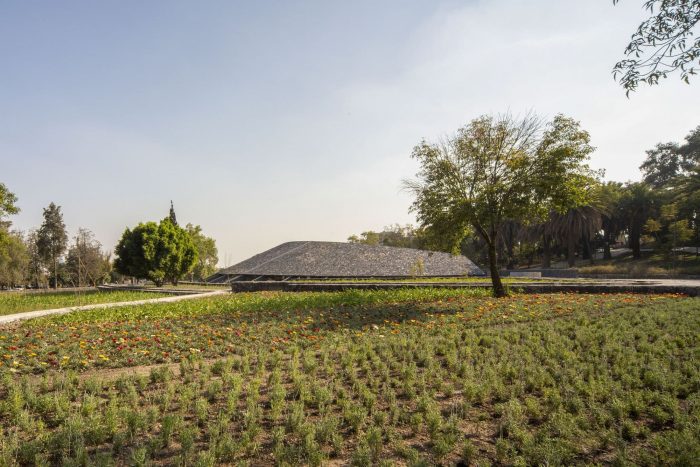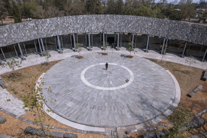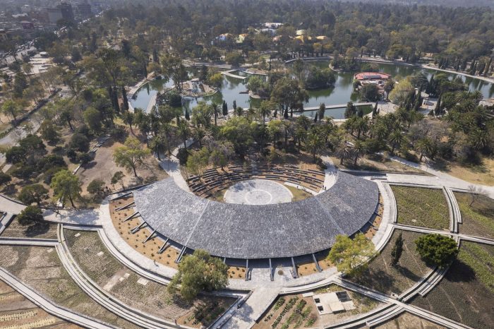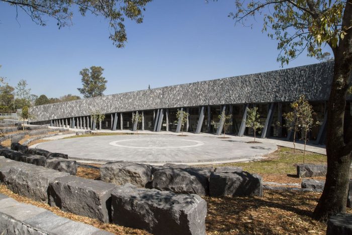 The Environmental Pavilion is conceived as one more element of the landscape. Its semi-conical geometry and its black stone cladding on the 2,000 m² roofs refer to the volcanic landscapes of Pedregal and are subtly integrated into its natural and cultural environment. The result is a light, flexible, versatile, and very low-maintenance pavilion. Its formal simplicity is accompanied by the conscious choice of optimal construction systems and new technologies that minimize its carbon footprint and its impact on the environment.