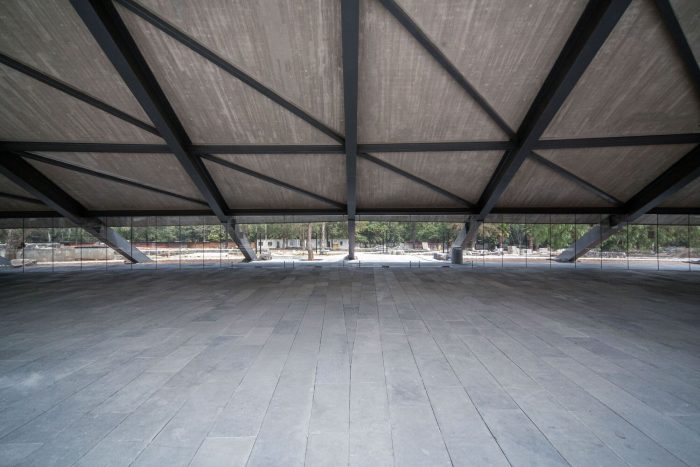 The interior of the Pavilion offers complete continuity and spatial flexibility that can accommodate and explore different museography proposals, always allowing visual transparency towards its two exterior fronts: the Gardens and the Cultural Space.