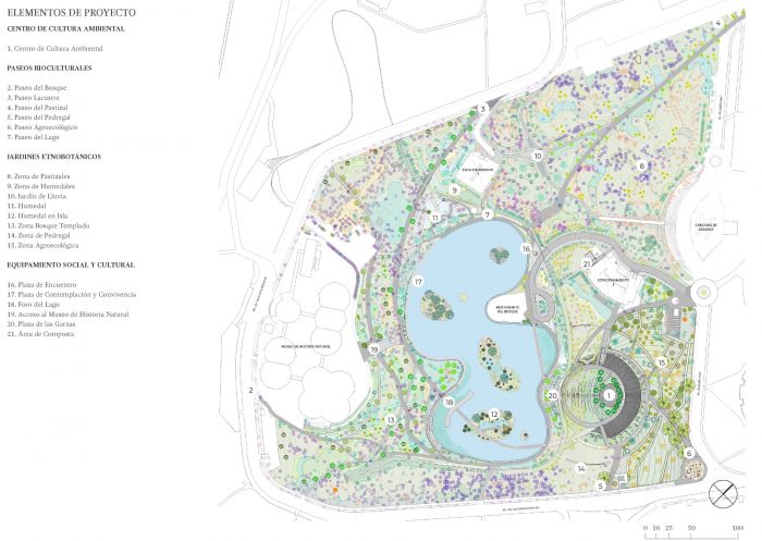 The project prioritizes the design principles of permaculture, which zones the space and regulates its level of maintenance according to proximity criteria, in this case to the Center for Environmental Culture. The irrigation system for the agroecological zone works by gravity. It begins its journey in Lago Menor and is distributed thanks to a visible master channel and several secondary channels with manual gates that optimize the use and management of water. The project provides a unique set of landscapes, emotions, encounters, activities, and learning in the context of an urban forest, ensuring compliance with its ecosystem functions and becoming an active promoter of environmental culture.