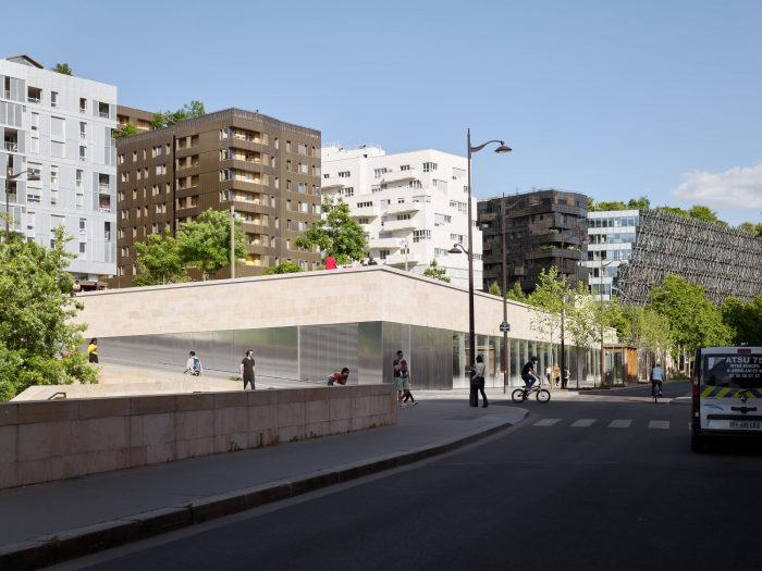 The project is a combination of infrastructure and architecture. Situated between the street, railway tracks, and Halle Freyssinet, the site defines the triangular plan, a folded ground, and a single facade emerging onto the street.
