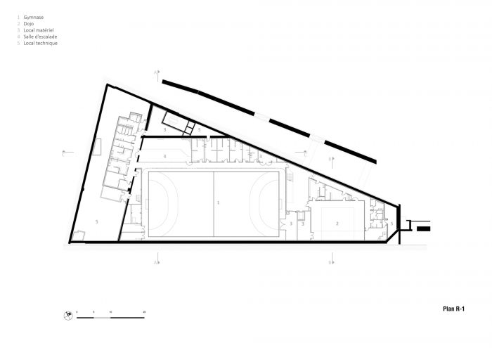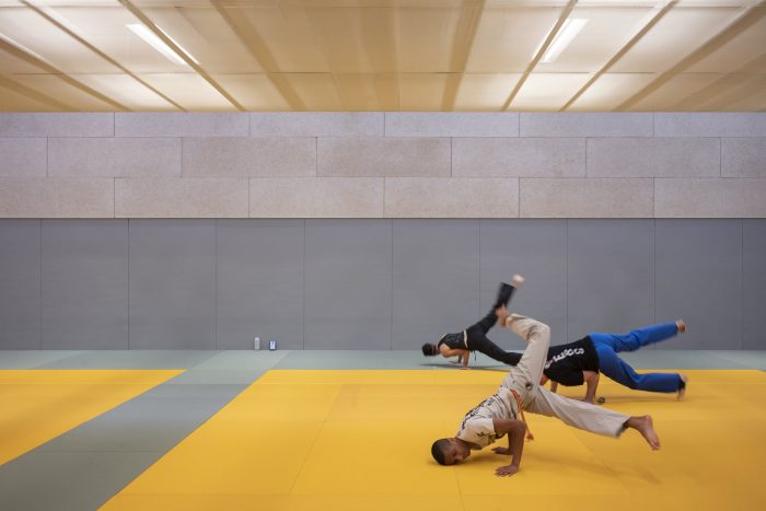 The climbing hall and the gymnasium form part of an identical volume. A wooden slated ceiling unifies the whole in an ample gesture curving towards the entrance. The dance hall, set back from the facade, offers a double-height on the dojo. This space is bathed in natural light coming from above.