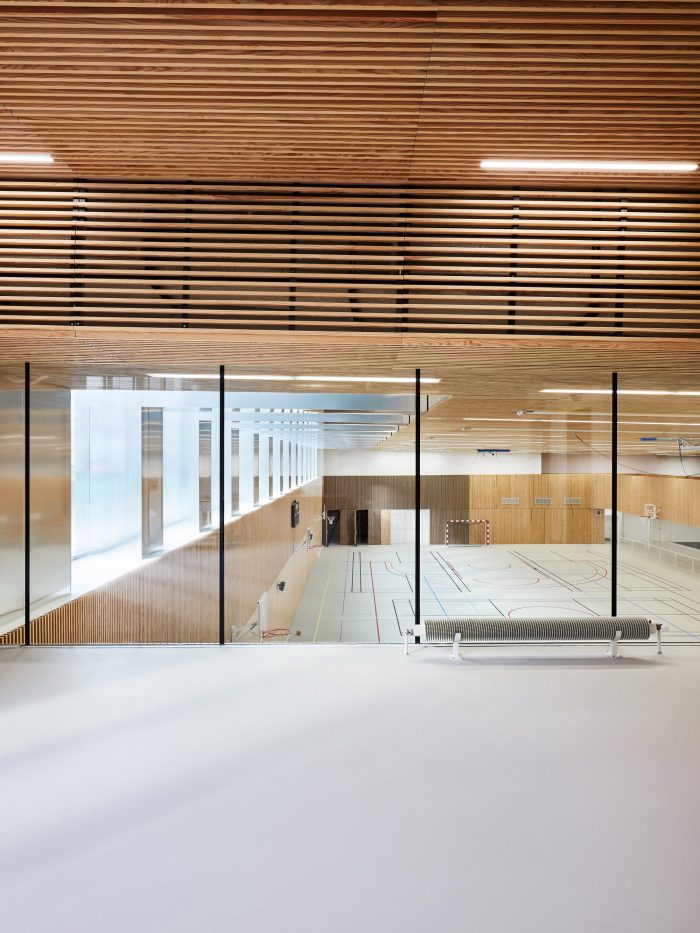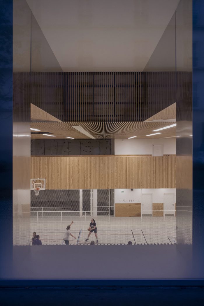 In its urban context, the building creates a landscape of horizontal layers, the slightly sloping stone volume emphasizing the weight of the garden and the glazed elements opening towards the interior of the gymnasium.