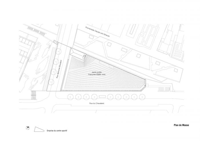 Charcot Sports Centre is part of a multi-program urban operation including an underground car park, a road bridge (extending from rue du Chevaleret and avenue de France), and a public garden.