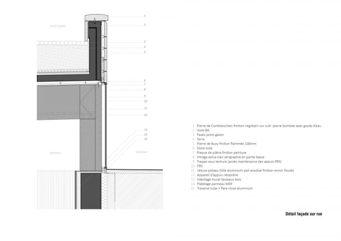 The gymnasium's roof supports a public garden that extends the promenade above the railway and the existing urban topography of the city. Bordered by imposing buildings, the project adopts a straight posture not exceeding the ground as much as necessary. Valuing the uses, it is the base of a wider urban dynamic than its primary destination.