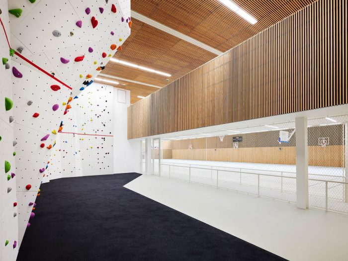 攀岩馆和体育馆形成了一个相同的体量。一个木质的斜面天花板将整个建筑统一在一个向入口处弯曲的宽阔姿态中。舞蹈厅背对着外墙,提供了一个双高的道场。这个空间沐浴在来自上方的自然光中。