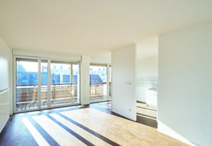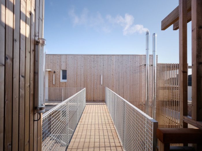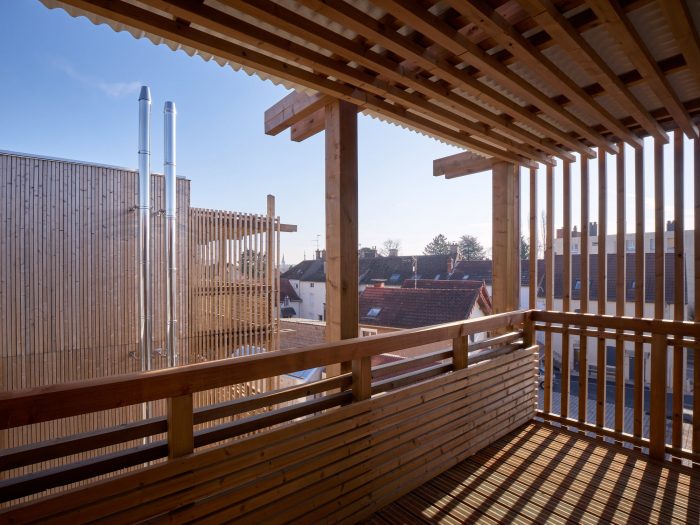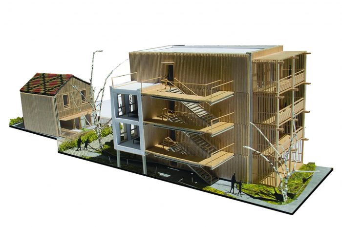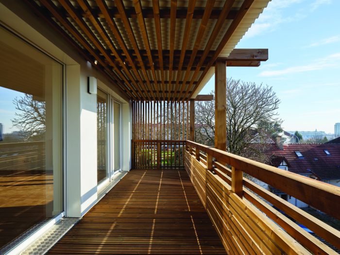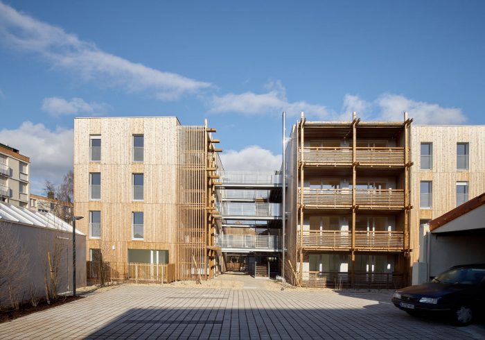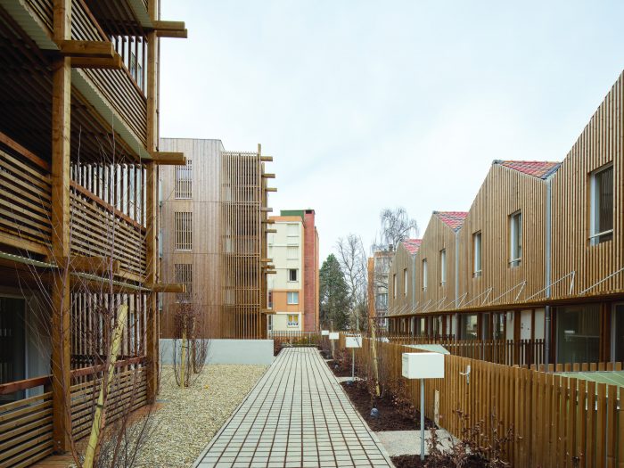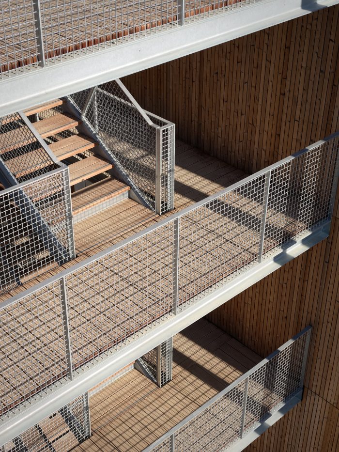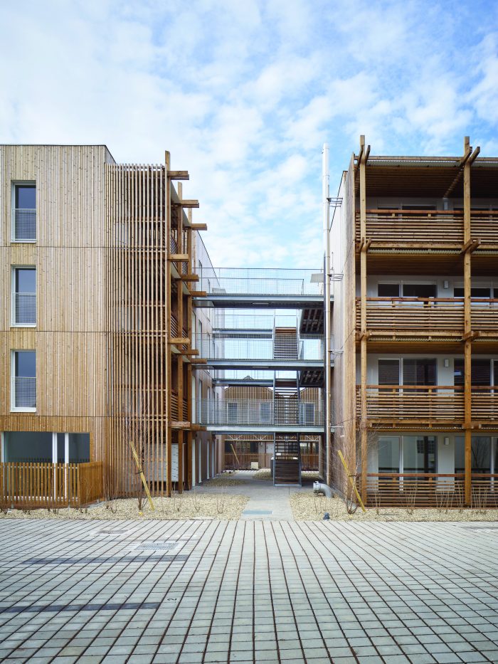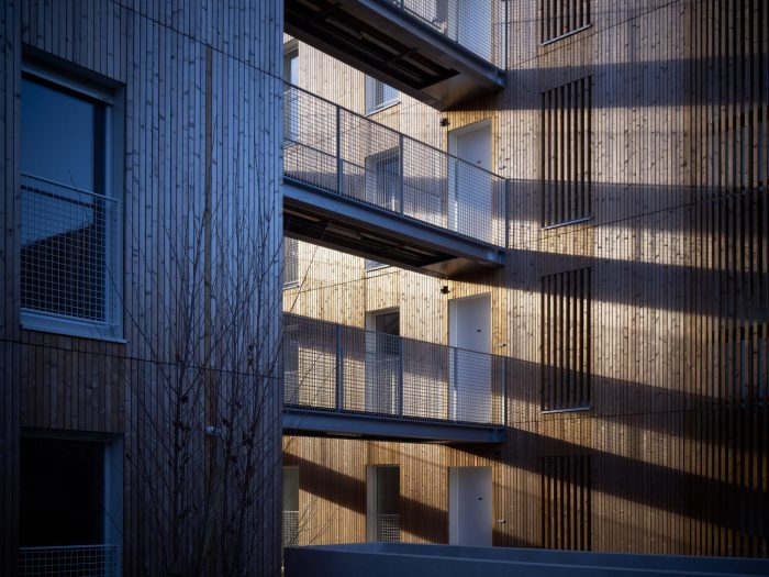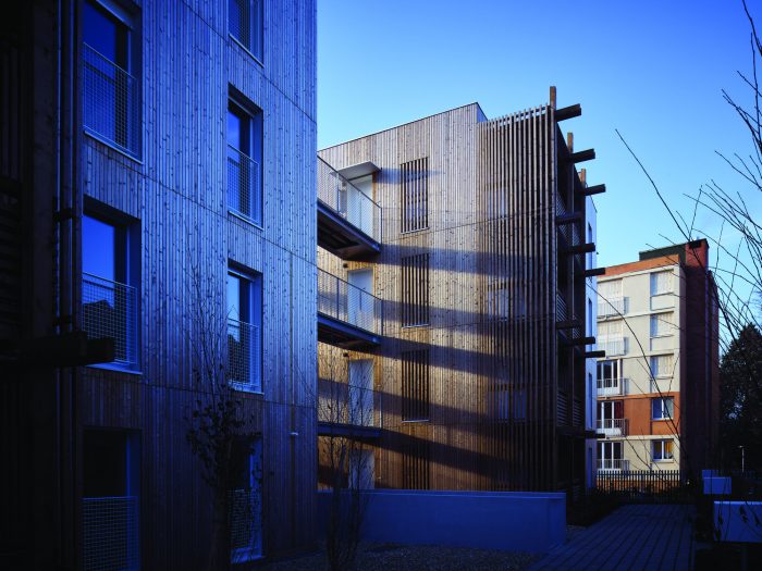 Using a cost-effective wood construction method was a priority. The structure, wooden posts, concrete floor slab and wooden façade framework meet the normative requirements in an economical way while eliminating intermediate support elements inside the housings to guarantee the flexibility of the spaces. This simple solution is made possible by the rationality of the plans and a rigorous superposition of the typologies.