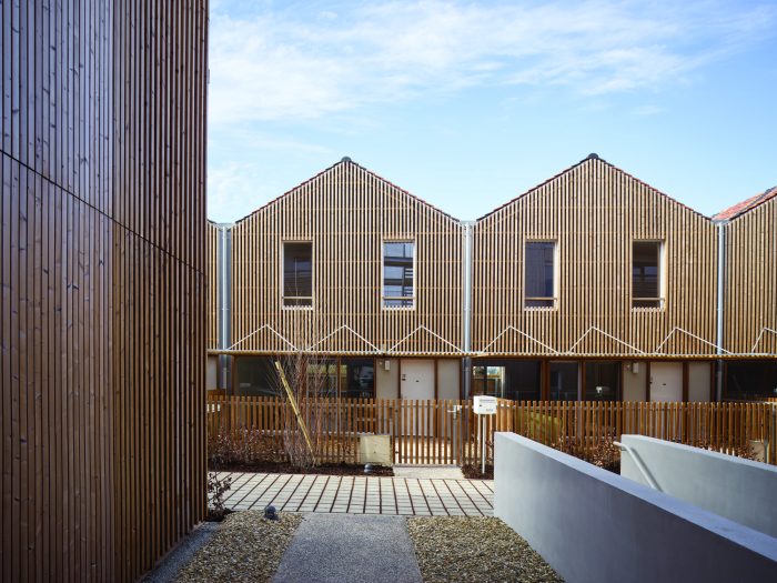 A paved central alley allows access to the row of houses. Each house has its own a private garden behind purple haze hedges. A wooden lattice awning protects the south facing living rooms from solar gain. To the back of the houses, the alternating volumes of kitchen and patio ensure the articulation with the existing urban fabric.