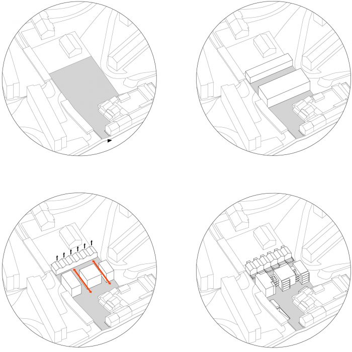 因此,该项目是围绕着自由功能空间和建筑体量交替进行的,这取决于场地的质量和限制。从街道入口到场地北部界限,入口、室外停车场、中间房屋、小巷、花园和独立的房屋,创造了一个城市序列,与邻近建筑的规模相匹配。
