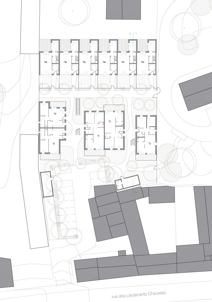 The project is thus built around alternating free functional spaces and built volumes depending on the qualities and constraints of the site. From the street entrance to the northern site limit, entrance, outdoor parking, intermediate housing, alley, gardens and individual houses, creates an urban sequence that matches the scale of the neighboring buildings.