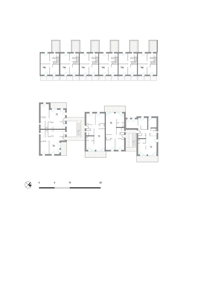 一组零散的中间住房(20套住宅)和一排排排屋(6套住宅)被安排在一个中央种植的小巷周围,为植被和户外空间留出空间。